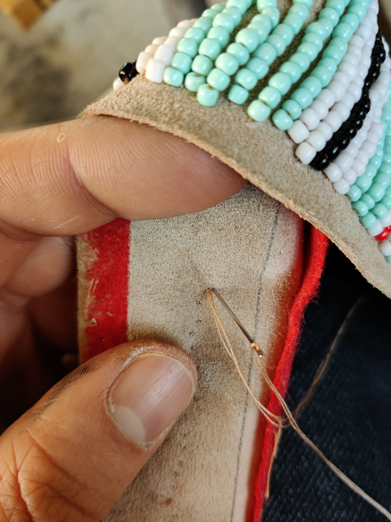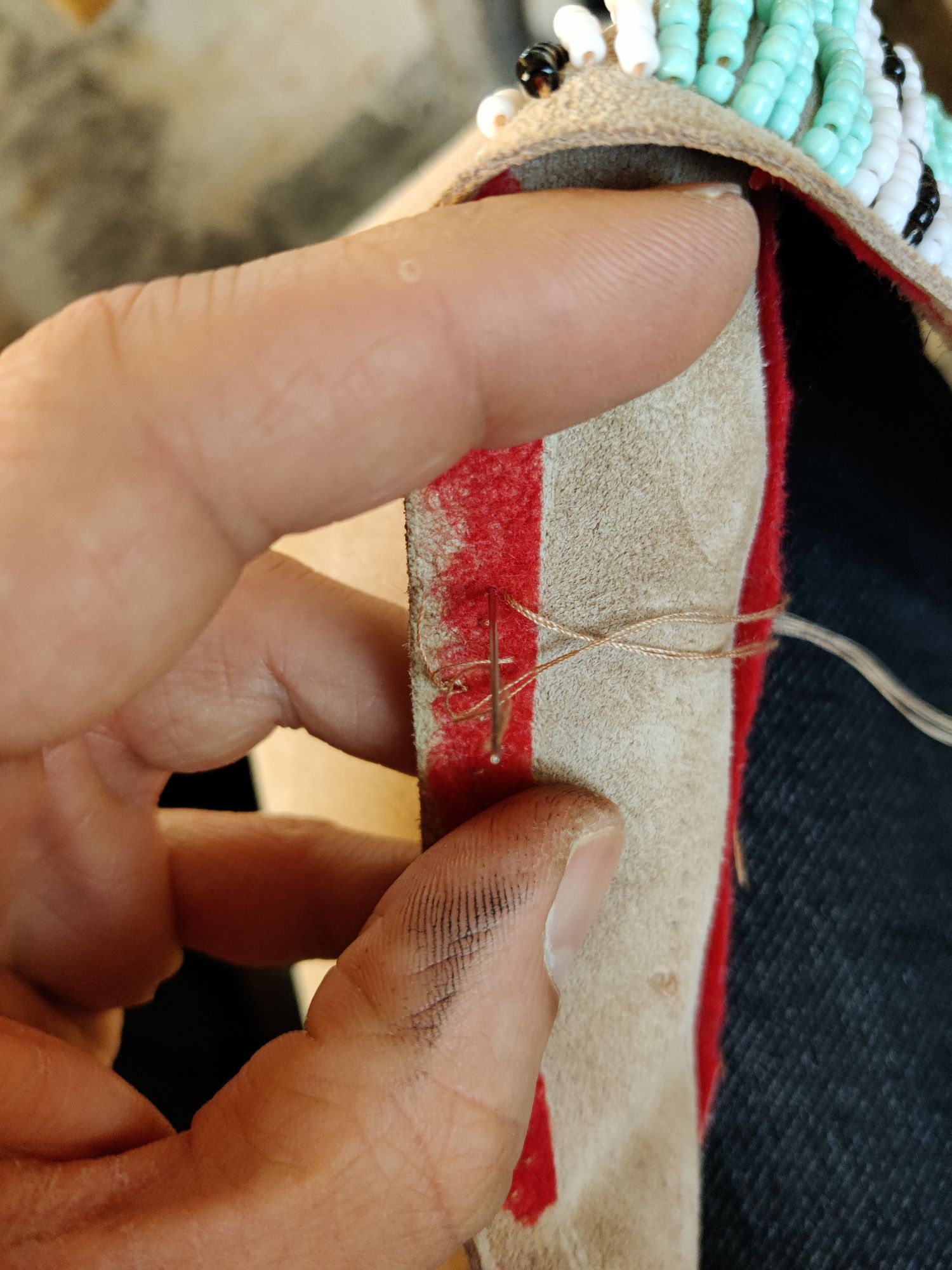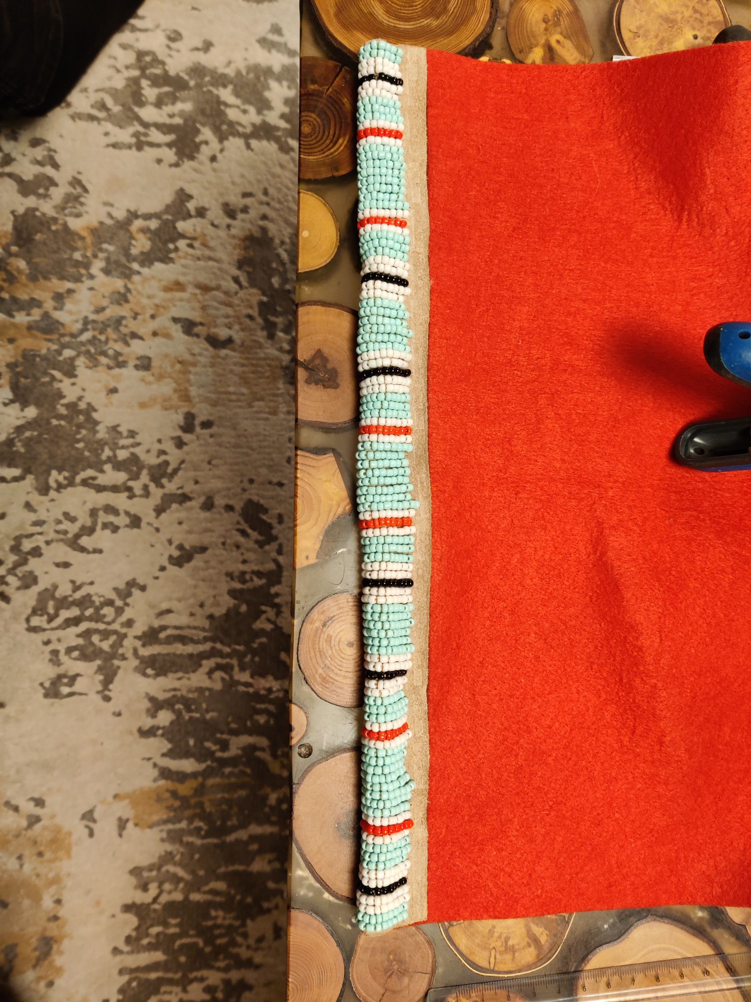 Der Köcher färbt jetzt nicht mehr ab und ich hab begonnen die Riemchen am Köcher zu befestigen. Zuerst mit Kleber auf Position fixiert, dann hab ich die weiße Perlenreihe befestigt, aber gleich alle am Stück ohne zwischenstiche. Wäre mir zu schwierig da beim durchstechen die richtige Position zu treffen. Deshalb hab ich dann für besseren halt unter der blauen Perlenreihe hin und her gestochen. Somit sieht man die Naht nicht.