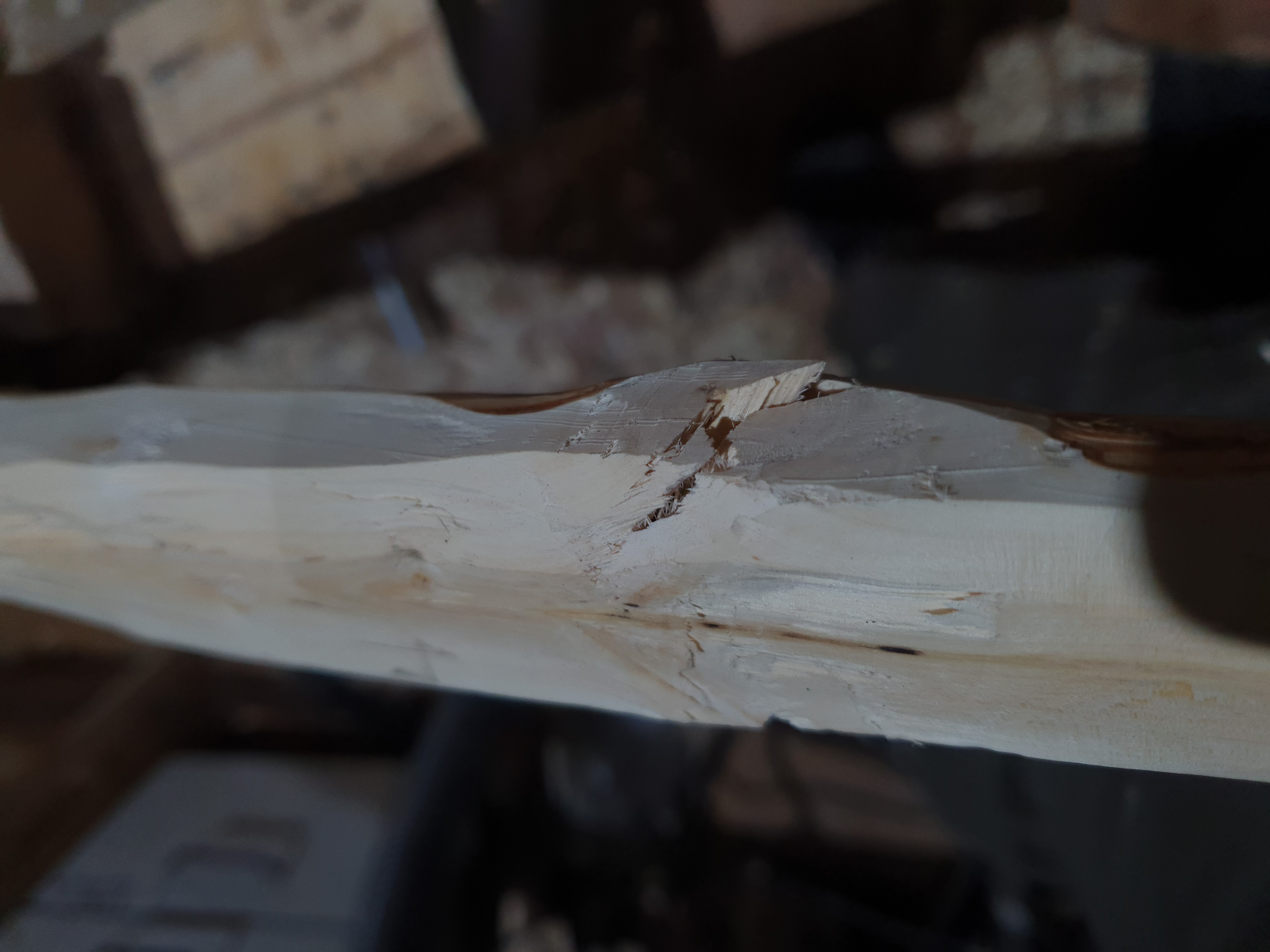 Der Riss schaut auf dem Foto ein bissl schlimmer aus als in echt. Der ist nur in dem Ast. Das auf der anderen Seite vom Stave ist nur ein Span, der da noch dranhaengt