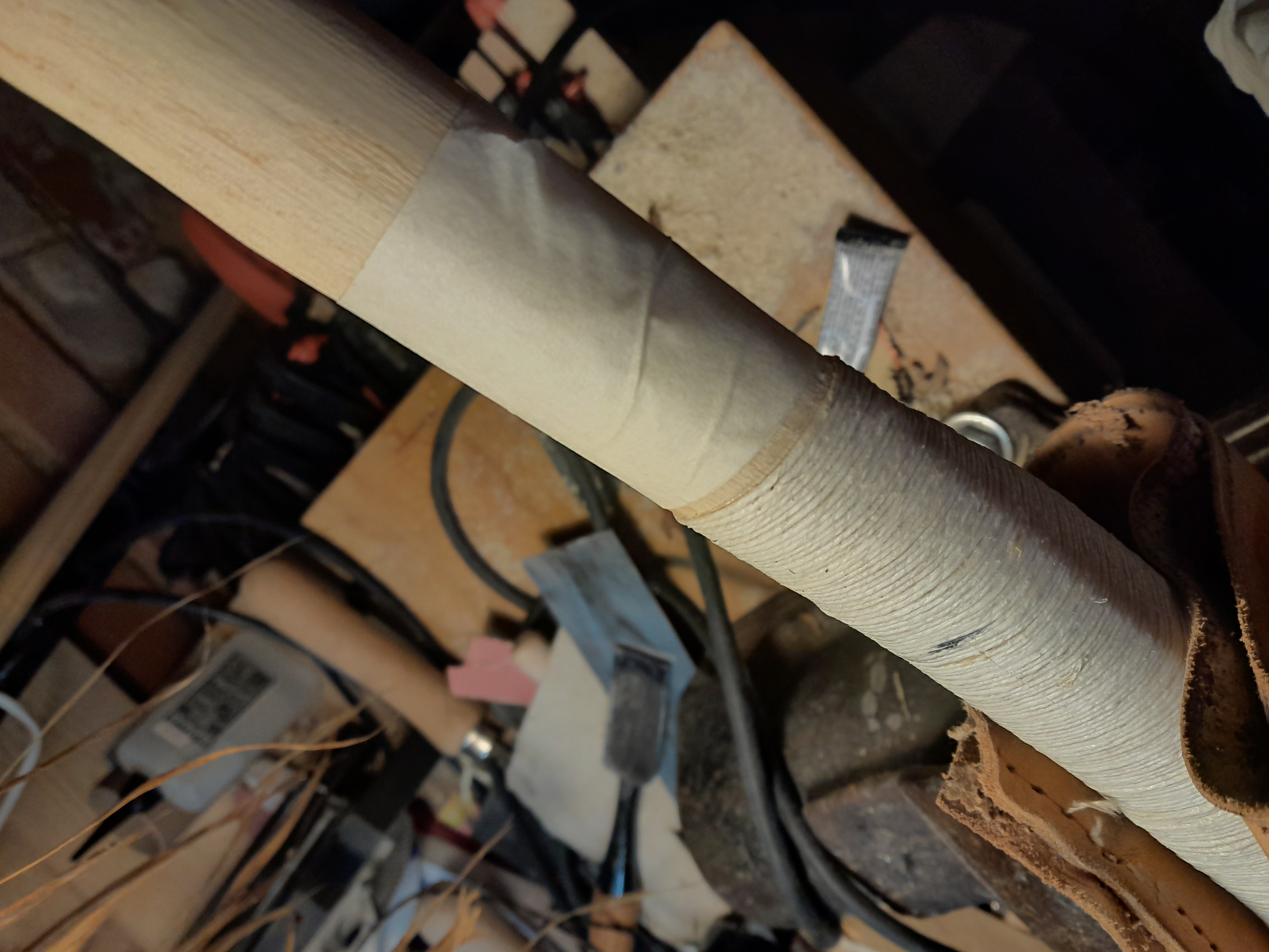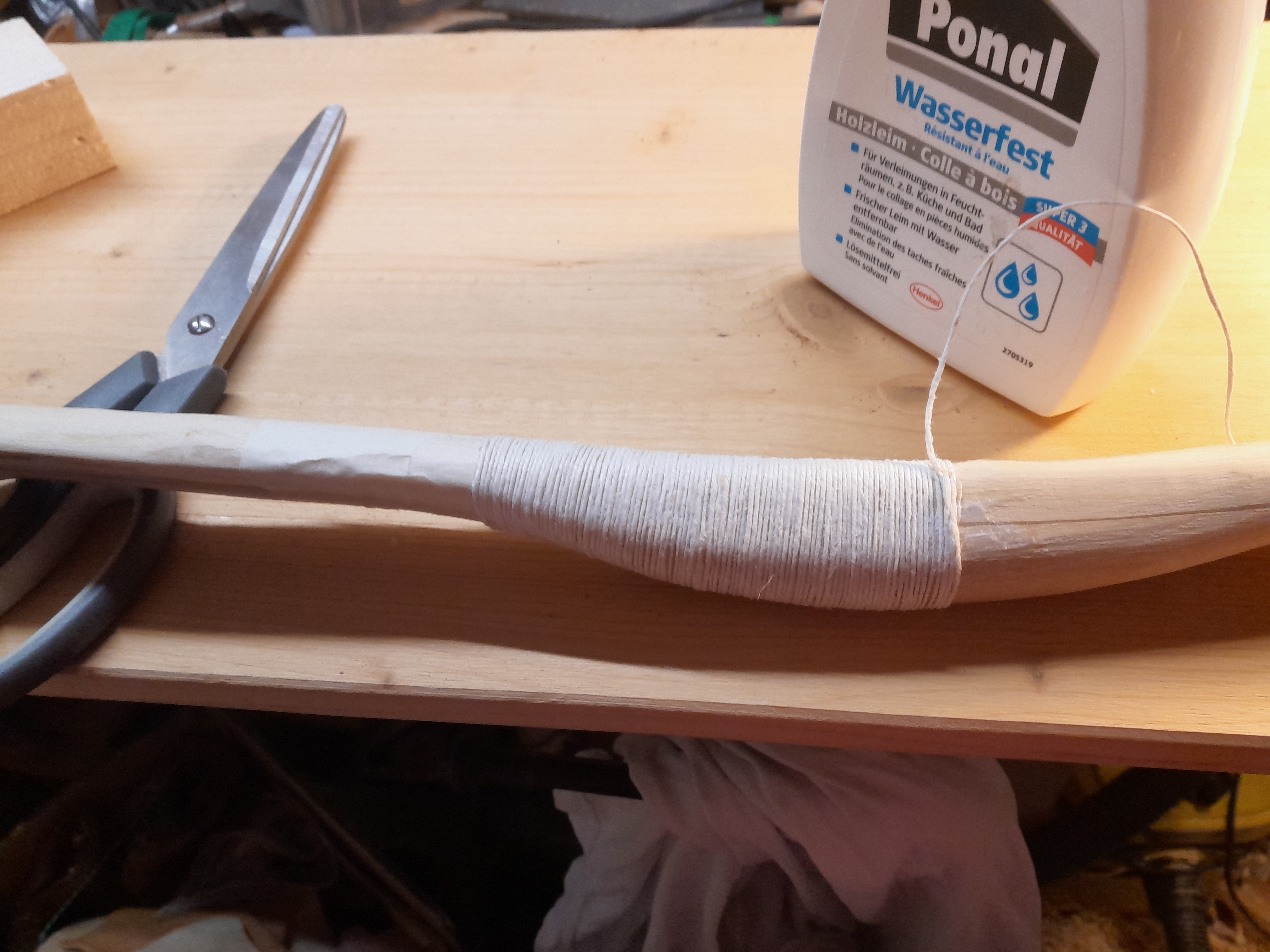 Den Griffbereich hab ich mit Schnur gewickelt, was grad zur Hand war und reißfest. Rollbratenschnur aus Leinen.