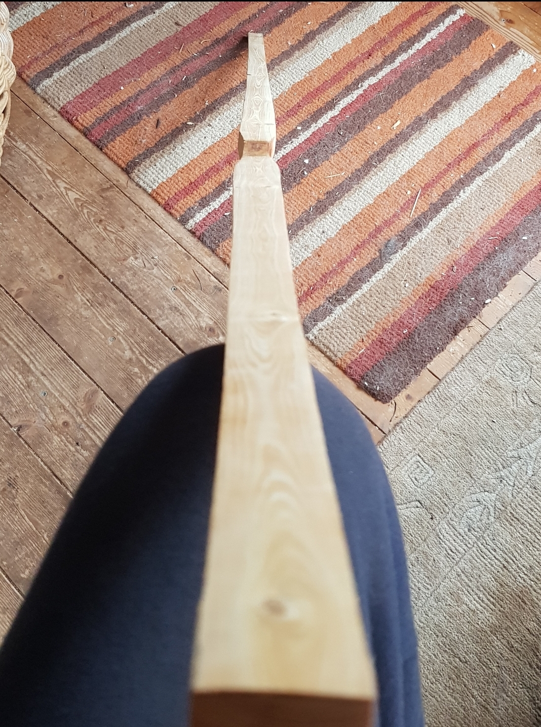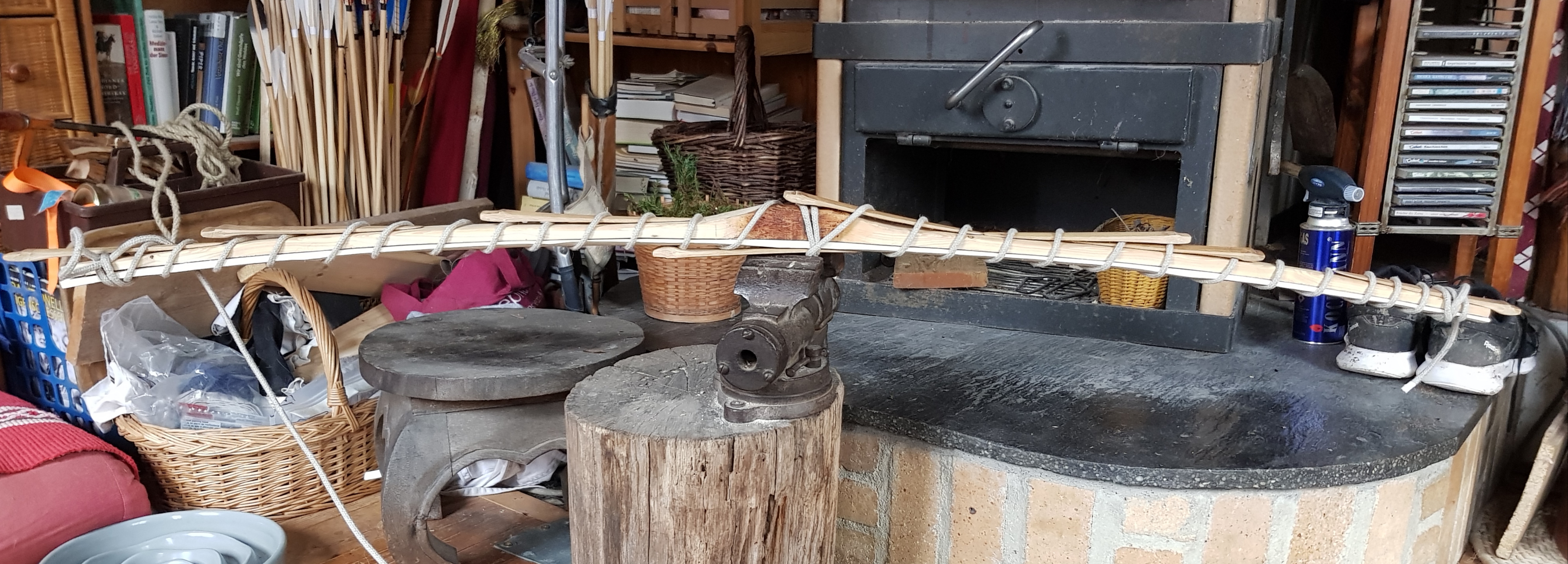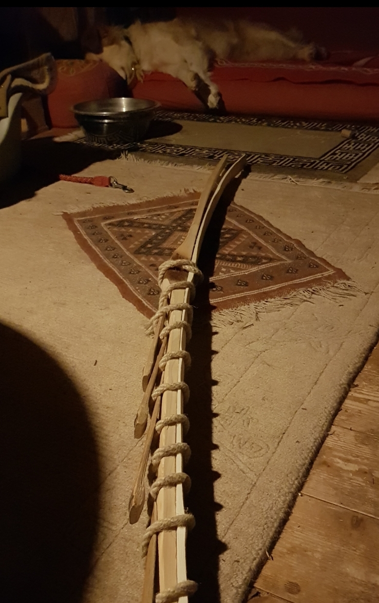 Bei diesem Typ des Zweiholzbogens reicht eine einfache Wicklung weil das Bauchholz so dick ist, dass es sich nicht verdreht und keine Formgebung des gesamten Bogens Teil des Prozesses ist... meines ist noch in der Dicken so überdimensioniert, dass ich hoffe, dass nach dem tillern noch was davon übrig ist...