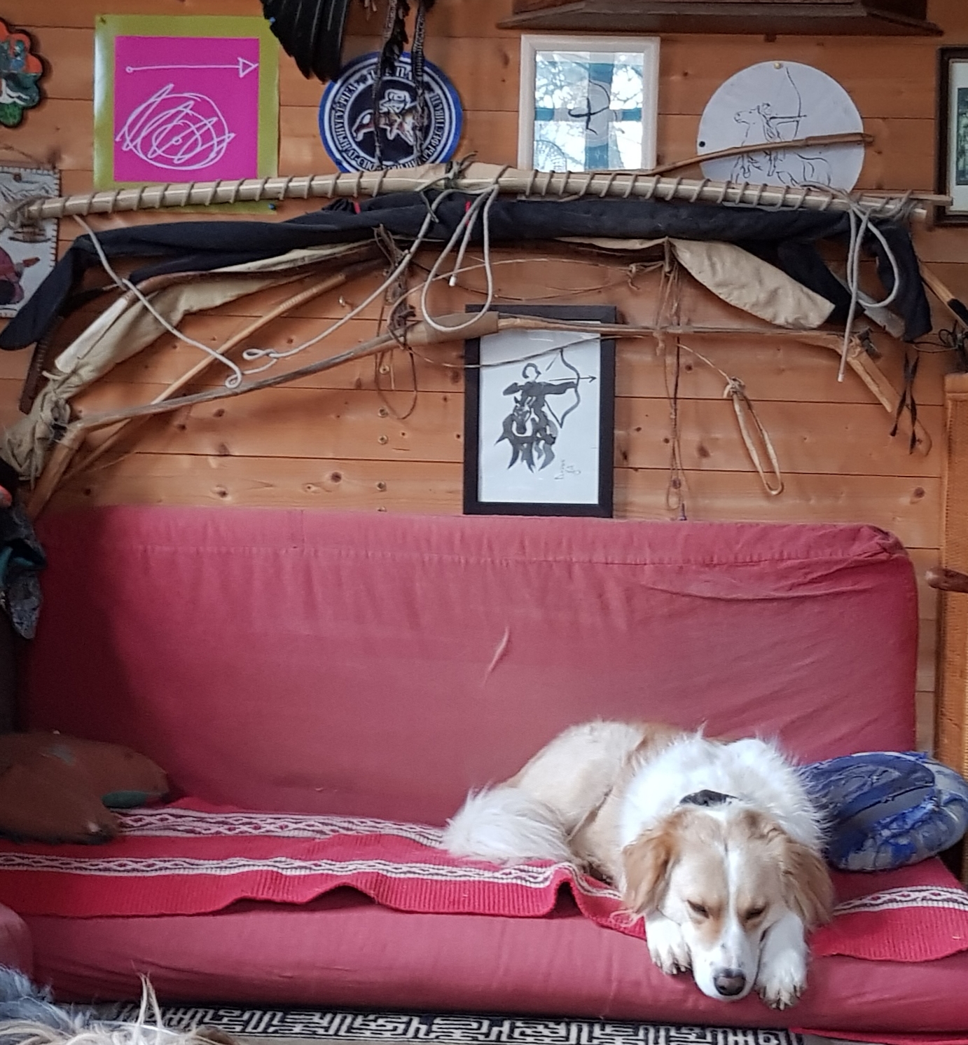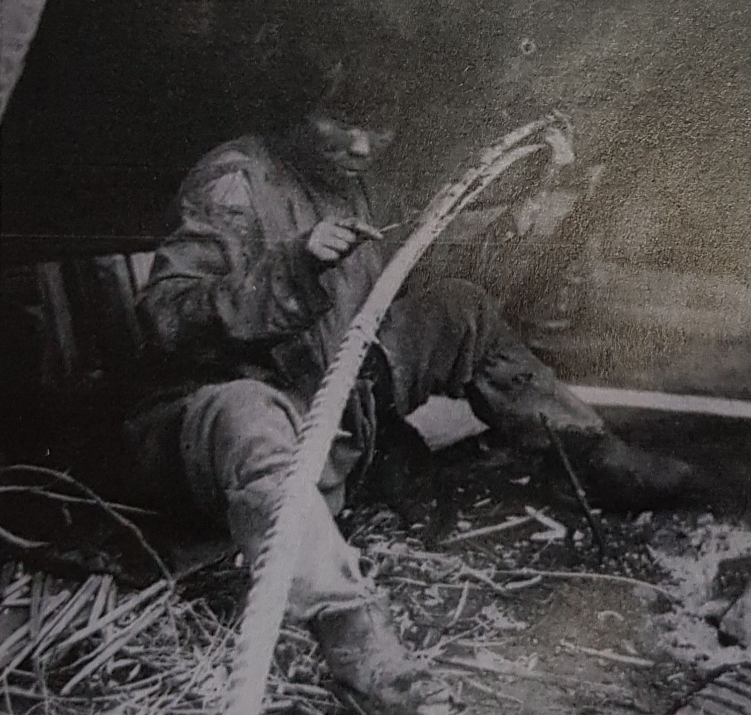 Zum gelieren des Hautleims: dick einstreichen, solange noch feucht zusammenfügen (Keile so eindrücken so das das Paket GUT hält), dann schrittweise mit der HLP (oder in Sami-Art über dem Feuer) erwärmen, Keile fest einschlagen und dabei die Form des Bogens einbiegen. Abkühlen lassen und zum trocknen beiseite legen.