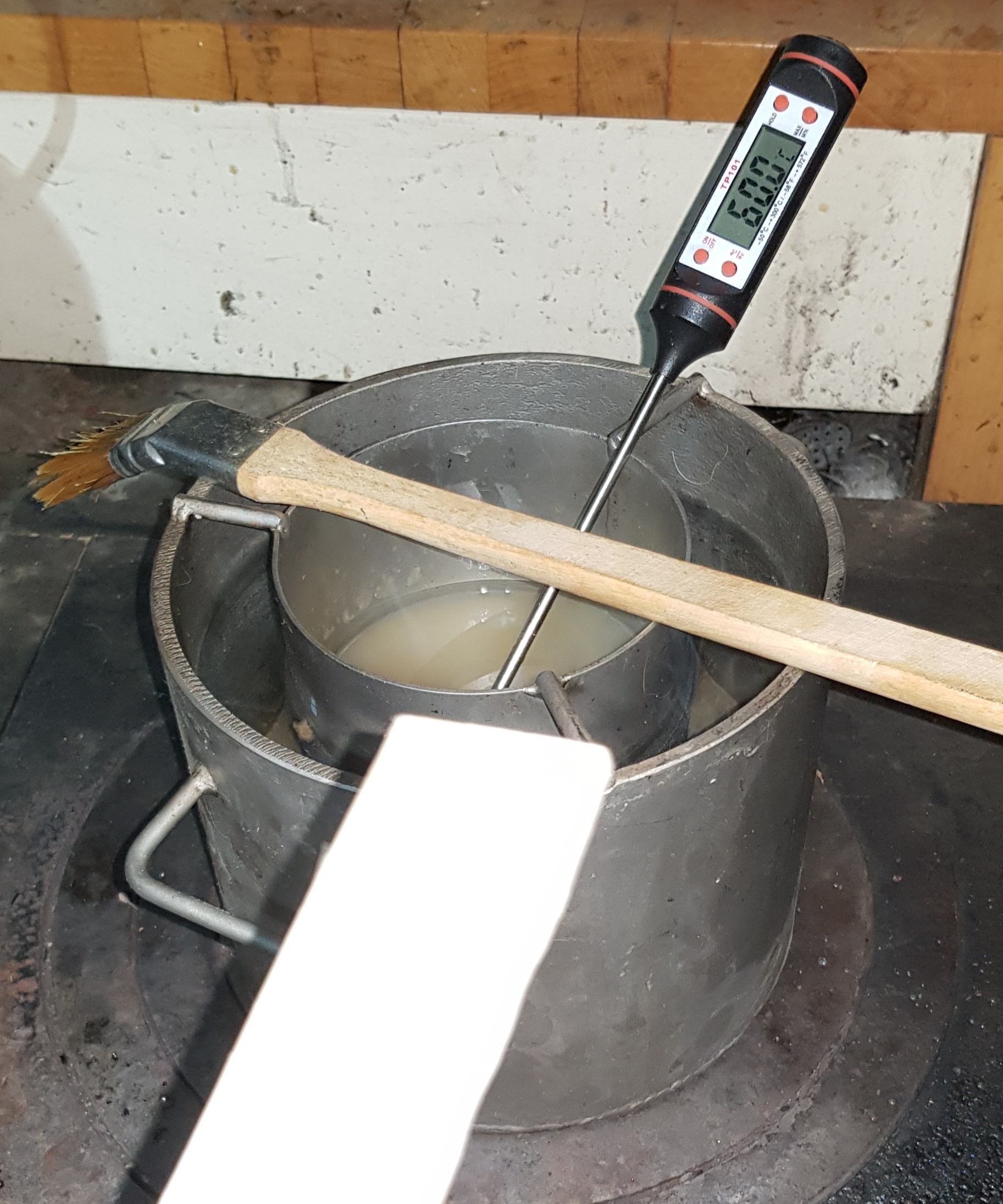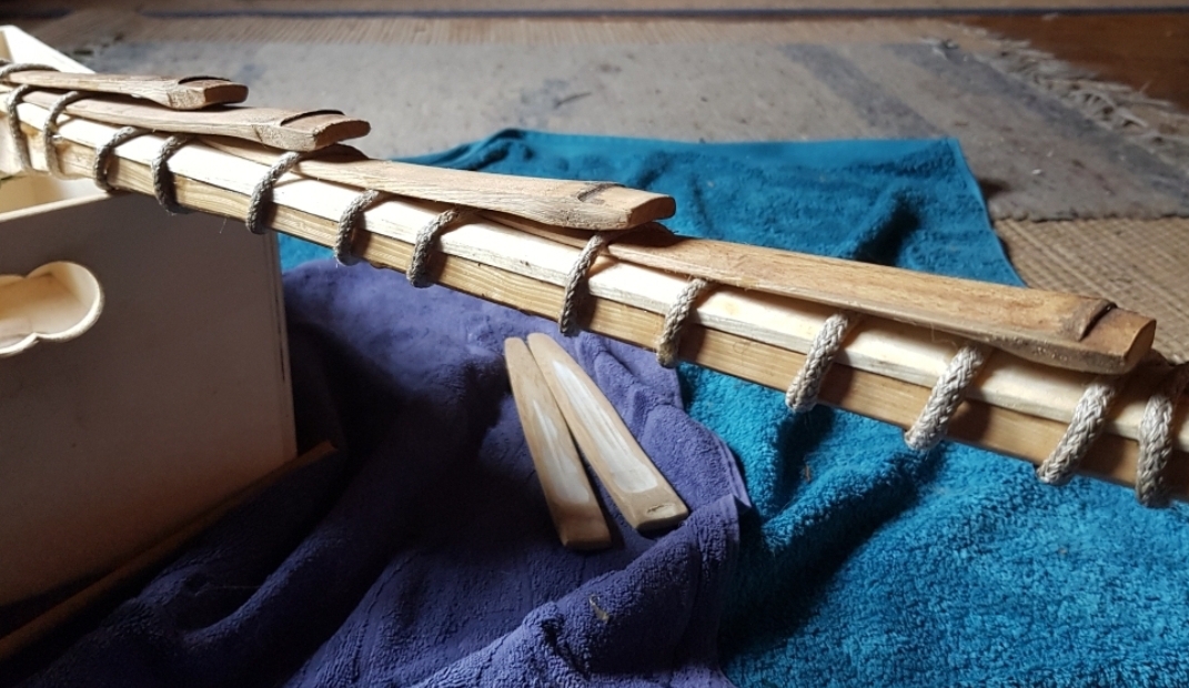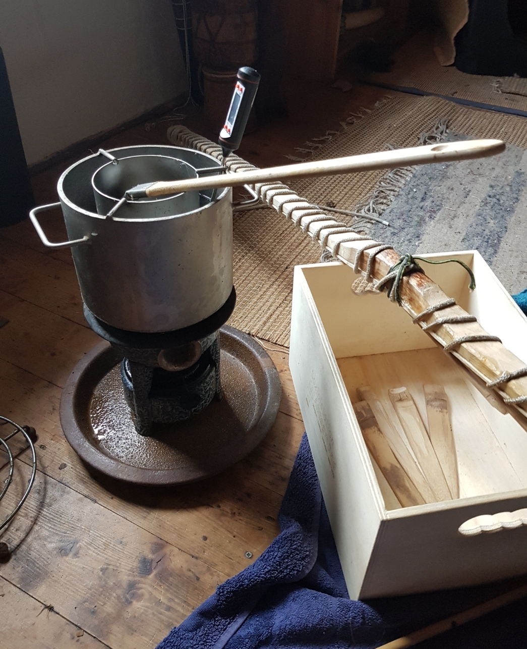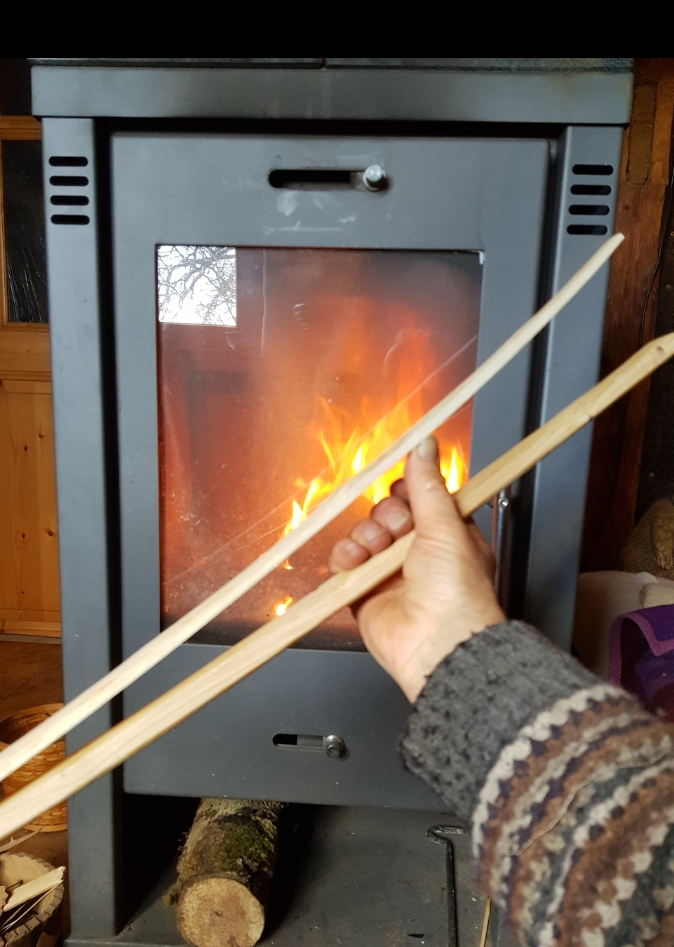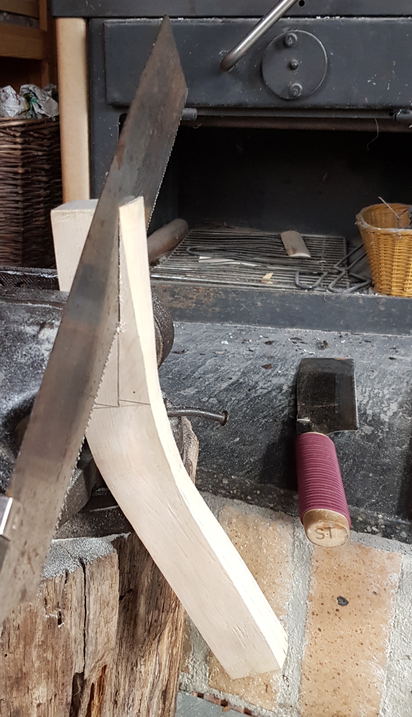 Zwischen jedem Leimauftrag das Holz über dem geschlossenen Holzherd erwärmt..