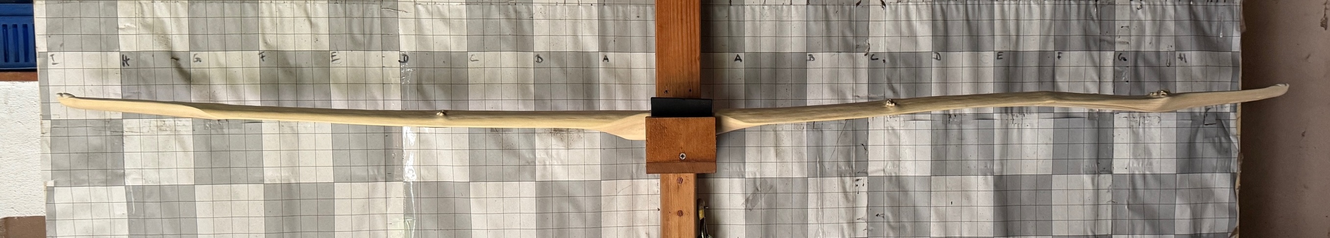 Ich habe jetzt 9cm Standhöhe erreicht und es sieht recht unsymmetrisch aus. Das war aber eigentlich klar wegen des deflexen Bereichs im oWa. Ich hoffe das geht sich ein wenig aus wenn die Standhöhe steigt. Ich will aber jetzt den uWa noch nicht zu weit schwächen. Mal schauen was sich beim tillern ergibt. Mit etwas Auszug sieht es symmetrischer aus. Die Sehne geht glücklicherweise mittig durch den Griff.