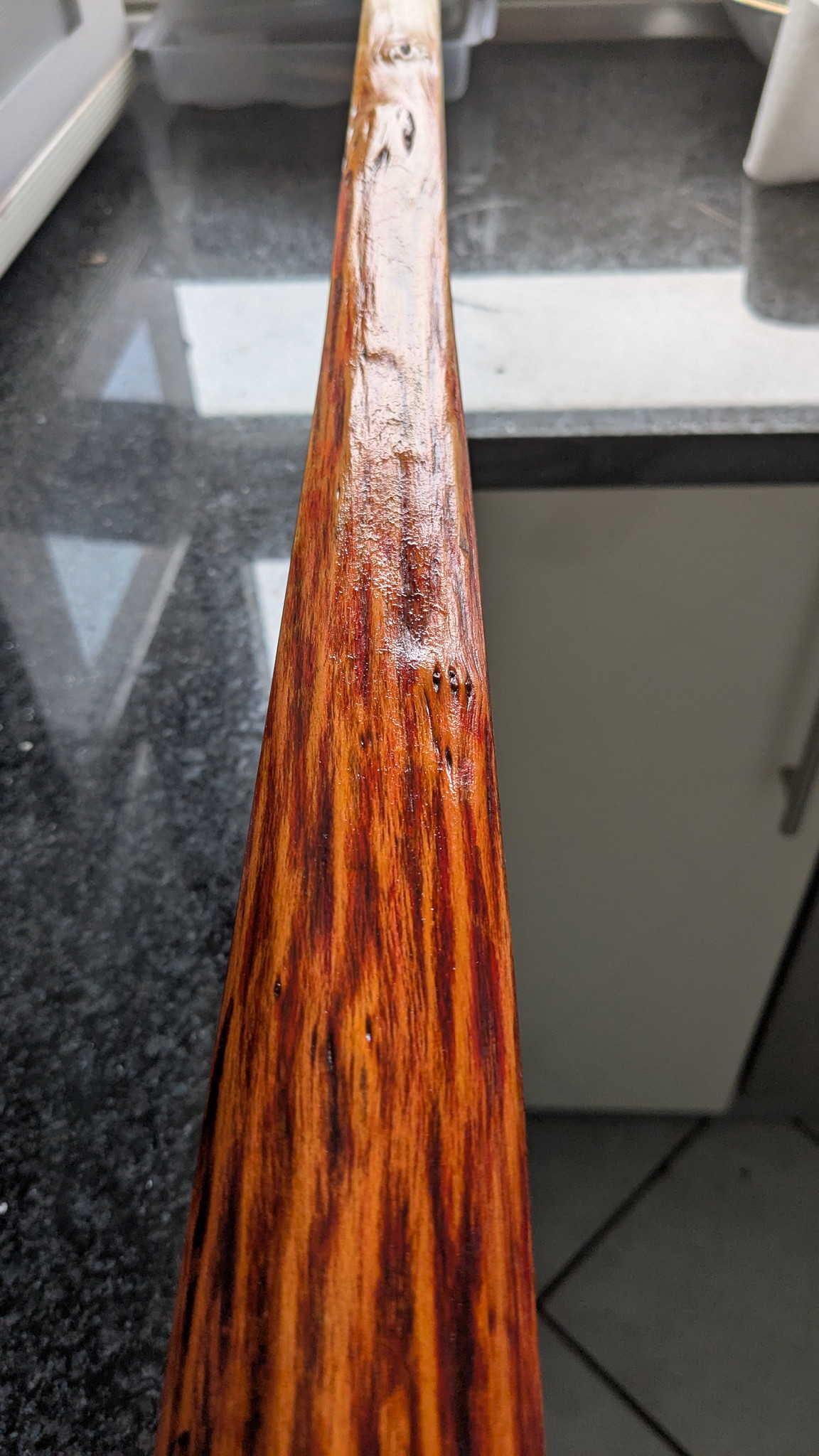 Gestern vorm schlafen gehen, hab ich die erste Lage Schellack auf den Rücken aufgetragen. Zum einen, dass die Zeit für mehrere Schichten reicht, zum anderen weil ich keine Lust mehr hatte, den Bogen immer vorsichtig am Griff anzufassen, um keine farbigen Finger zu bekommen. Aus Angst, mit dem Pinsel die Farbe zu verschmieren, hatte ich die großartige Idee, den Schellack mit Aceton zu verdünnen, in eine Sprühflasche zu geben und auf den Rücken zu sprühen. Hat nicht so gut geklappt... Der Sprühnebel war nicht fein genug und ich hatte überall Tropfen. Bis ich hektisch einen Pinsel geholt hatte, war der Lack schon so weit angezogen, dass ich ihn nicht mehr ordentlich verteilen konnte.