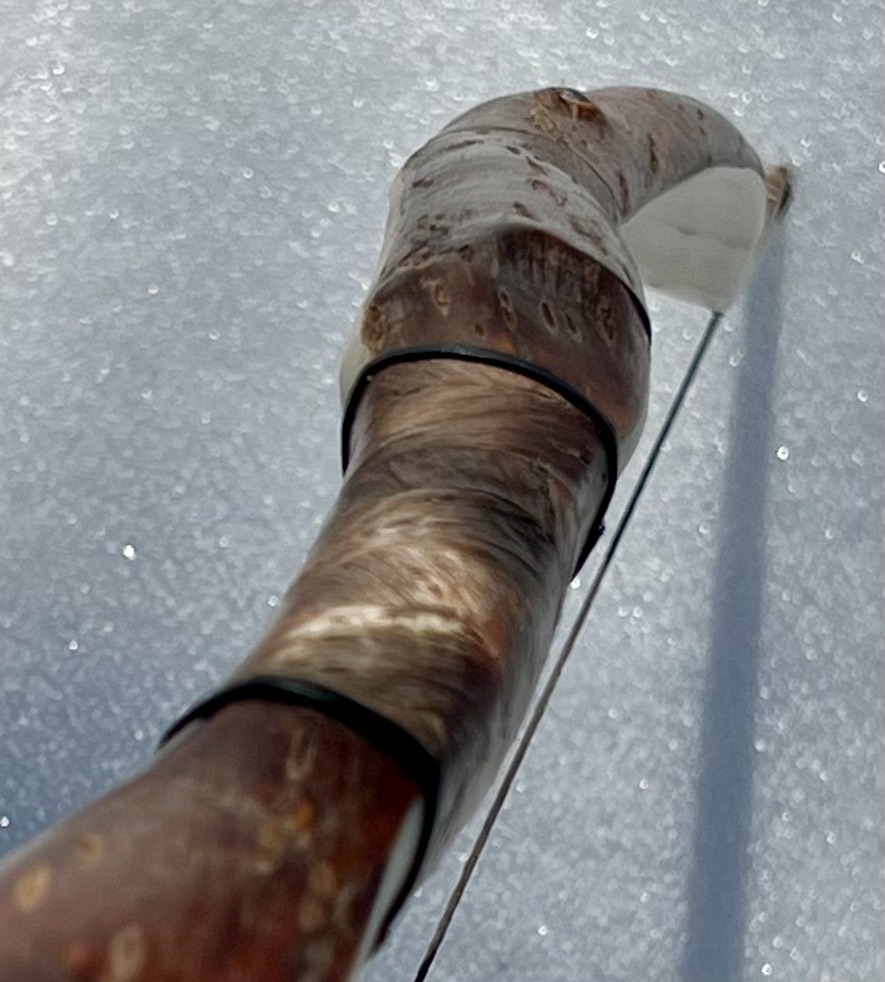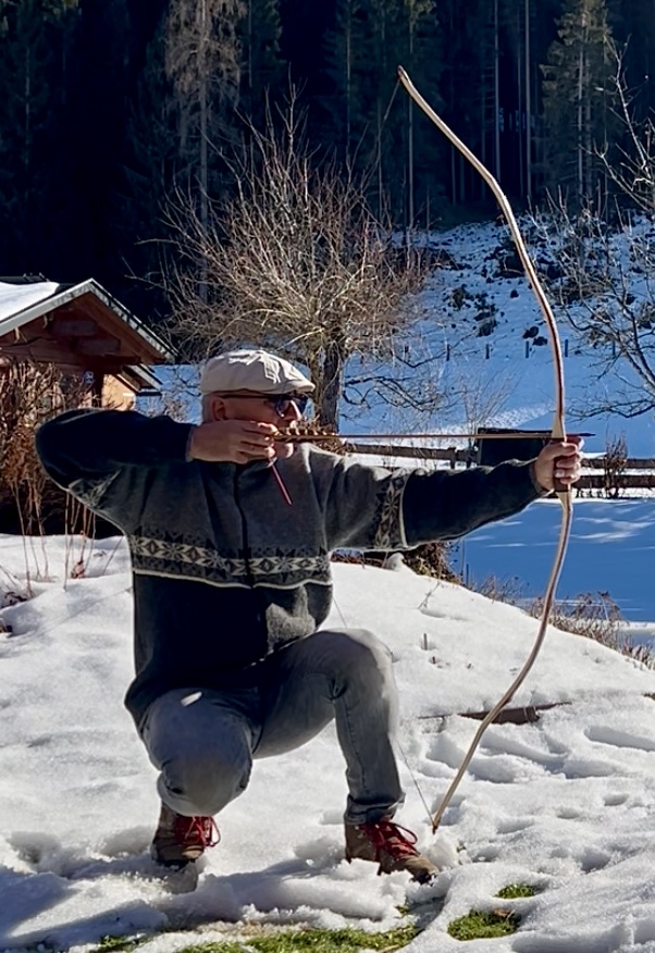 Ein sehr kurzer Stabbogen aus einem Stängel von nur 22mm Durchmesser aus einer Hartriegelhecke in meinem Garten. Die Sehnenlage hatte sich immer wieder beim Aufspannen verzogen weshalb ich ihn gekürzt habe und schließlich den Bogenbauch sehr einseitig abgetragen habe. Nun passts. Oberhalb des Griffs knitterte er heftig wegen eines quer sitzenden Astes. Deshalb war eine Reparatur nötig. Diese ist unter Nutriafell versteckt. Der Bogenbauch ist leicht geröstet.