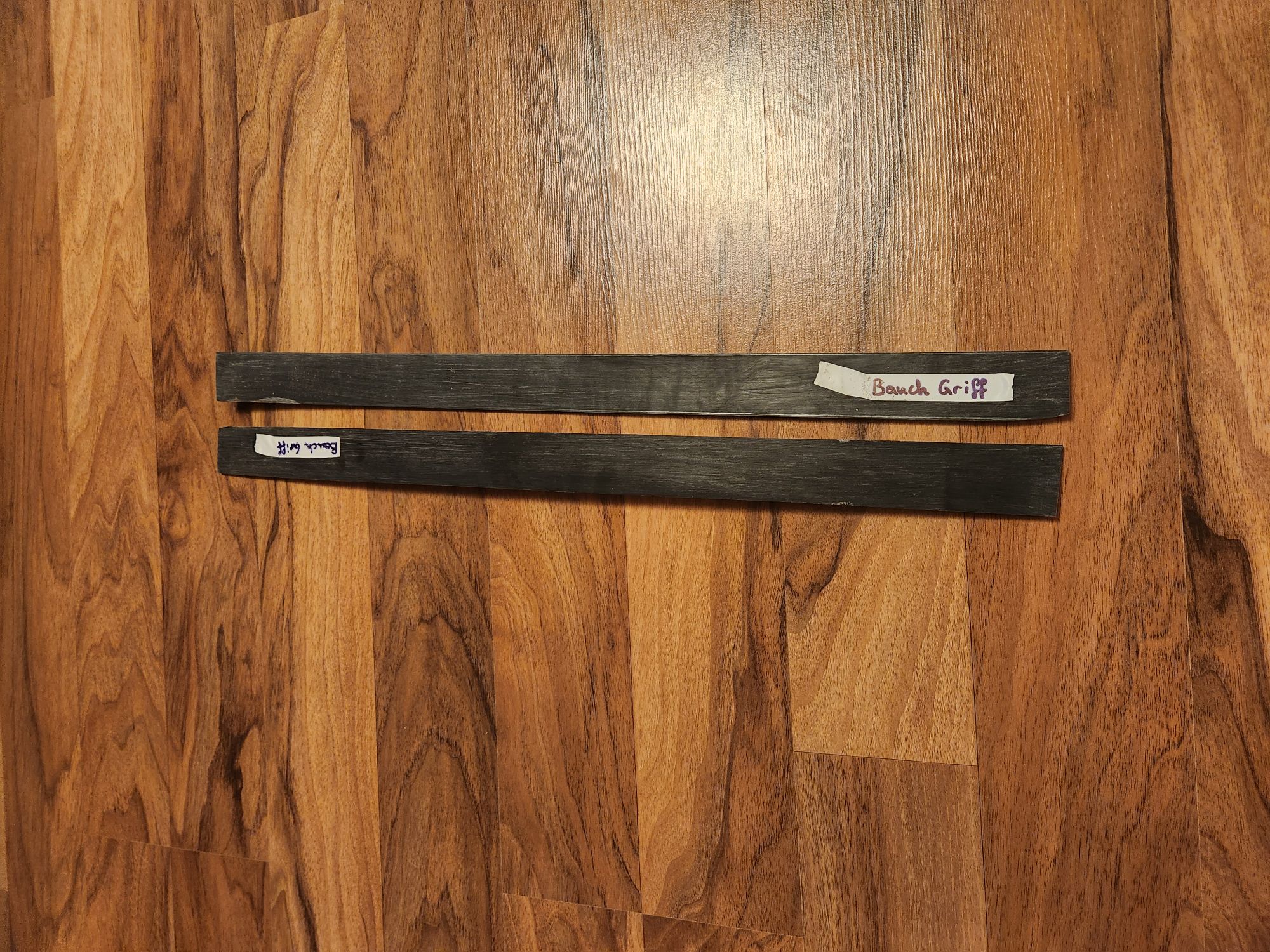 In der Zwischenzeit hab ich schon mal ein paar Sehnen zerfasert, und den zweiten Siyah geklebt. Dann kamen heute auch schon die neuen Bambuslaminate. Die sind schon mal mit etwas Übermaß auf Länge geschnitten.