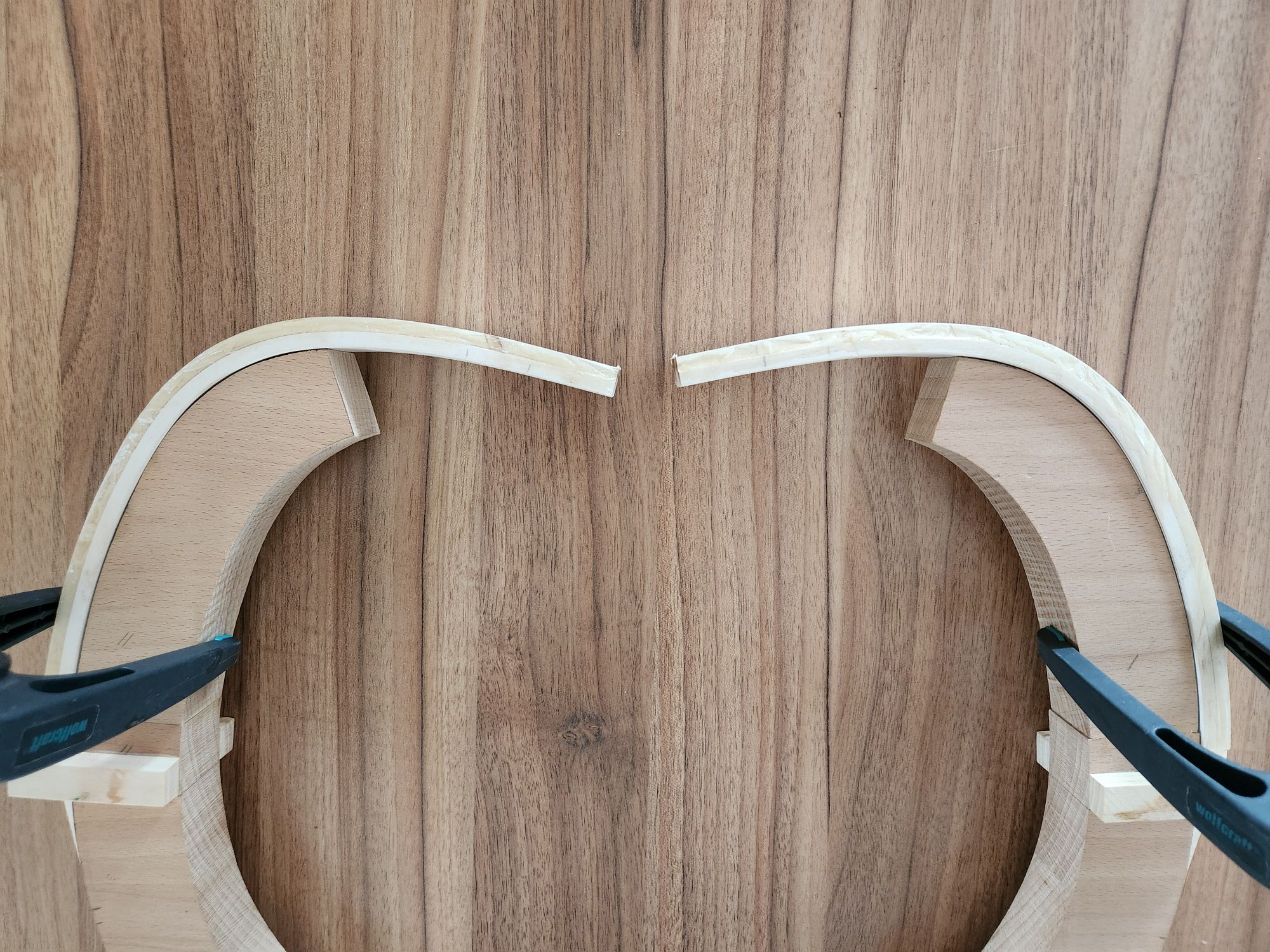 Die Hornstreifen hab ich auch in der Breite reduziert. Meine Laminierform ist nur 34mm breit und hat ja beidseitig Führungsklötze mit ebenfalls diesem Maß. Wenn man diesen Bogen dann nach den ganzen Klebearbeiten seitlich nacharbeitet bis alles gut aussieht kann man schnell mal bei einer breite von nurmehr 30-32mm landen. Diese Bögen wurden auch mit einer Breite von nur 25-30mm gebaut, weshalb mir das damals passend schien. Jetzt hätte ich aber doch gern die Option ihn breiter zu bauen und mehr reserven für Korrekturen zu haben. Deshalb werde ich das Maß zwischen den Führungsklötzen auf 36mm erhöhen. Die Hornstreifen sind jetzt auch 36mm breit und um noch mehr Raum für korrekturen zu lassen, werde ich die Siyahs diesmal noch nicht in Form bringen (wurde beim Original aber schon vorm Spleißen gemacht).