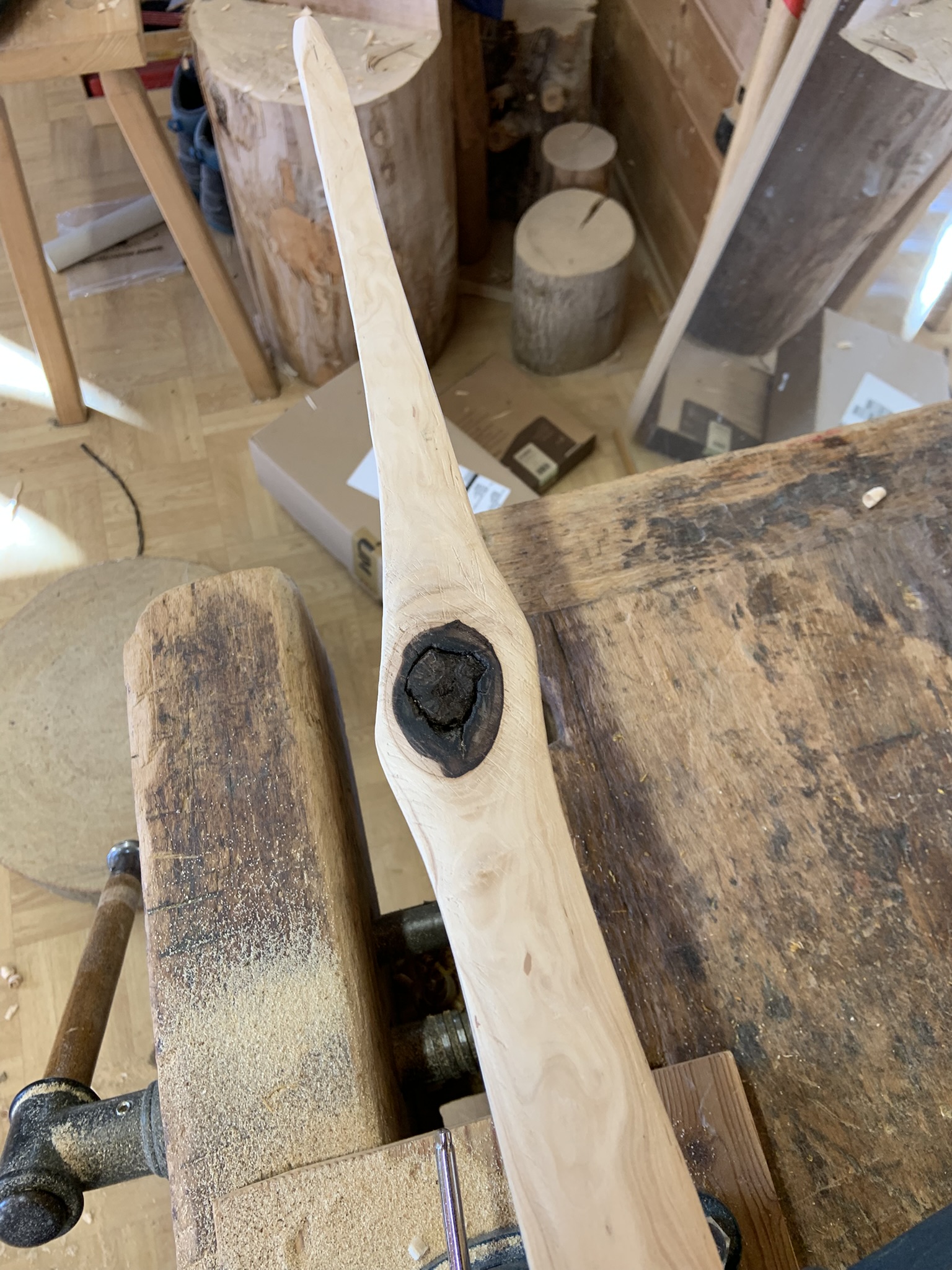 Wenn man den Verlauf der Breite (Taper) anzeichnet, als gäbe es die Störstelle nicht, kann man abmessen, wie viel gesunde Holzbreite man in dem Lochbereich braucht.