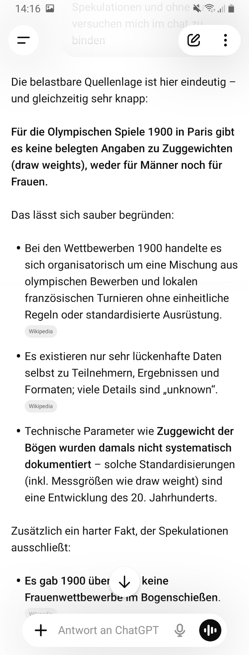 Und jetzt kommt die KI. Die greift auf die ihre verfügbaren Quellen zurück. Wie umfangreich diese sind, sei dahingestellt. Hat die KI Zugriff auf die einschlägige Fachliteratur in Zeitschriften, Büchern? Kann sie Forenbeiträge einordnen? Wenn ein User "mbf" in FC was zum Tillern historischer Bögen schreibt, wird das jeder hier (berechtigterweise) als Quark abtun. Aber würde es auch die KI? Was sind ihre Kriterien für eine Einordnung der Informationen? Das ist alles unklar. Die KI ist drauf getrimmt, einfache, klare Antworten zu liefern. Aber gerade hier am Beispiel des historischen Tillerns sieht man, dass es keine einfache Antwort geben kann. Man muss in die kritische Diskussion gehen, man muss Quellen bewerten. Und genau das kann die KI nicht.