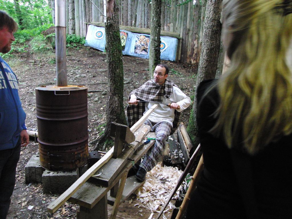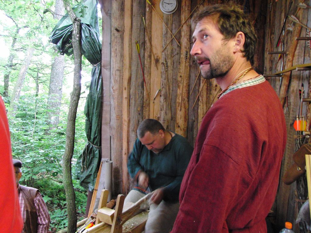 Blick auf das Herrenhaus wo Abends üblicherweise das gemütliche Beisammensein stattfindet Freitag Abend bezogen wir das Weberhaus, wo unsere Mädels sogleich für ein gemütliches Ambiente sorgten Frühstück machen im Weberhaus. Jan1 meinte es etwas zu gut mit dem Feuerholz, die gußeiserne Eierpfanne war rotglühend... Moni an ihrem Webstuhl, der beim 2. SDÖBBT im Singerhof gebaut wurde Aufgrund des Regens verlagerten wir die Bogenbautätigkeiten auf Rainers überdachten Schießstand, der dem Keltendorf angeschlossen ist. Fleissiges Schnitzen am Samstag. Holger (sitzend vorne rechts) müht sich mit einem Hartriegel ab. Hinten stehend: Rainer und Lothar. Es erschienen auch immer wieder neugierige Keltendorfbesucher, die sich für Bogenbau interessierten Sepp an seinem Eschenflatbow Martin kämpft mit seinem snake Liguster, Lothars Gesichtsausdruck zu deuten vermögen wahrscheinlich nur die Götter.. Jan2 von den Teutates, an seinem Eschenstave. Dieser wurde wegen seines geringen Durchmessers decrowned. Jan eigentlich nur ein "normaler" Kelte und hat sich uns erst in Gabreta angeschlossen als er von dem Treffen hörte.. Lothar fand das Langschwert der Selgarios interessanter als seinen Ebereschenbogen..