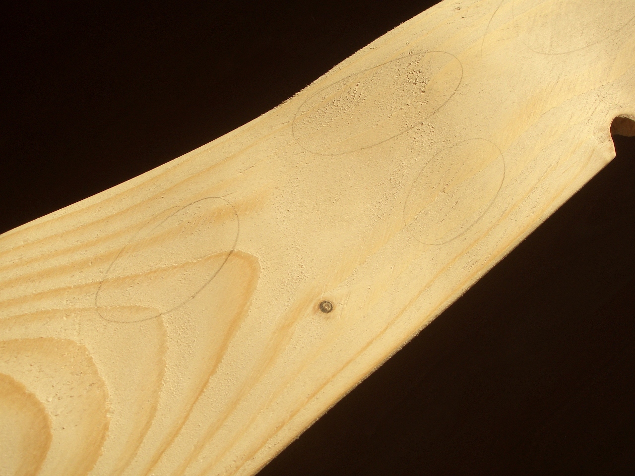 Ich hab mich weiter damit beschäftigt, Raspelspuren zu entfernen. Da meine Werkstatt mäßig gut ausgeleuchtet ist und ich meist nur in den Abendstunden dazu komme, am Bogen zu arbeiten, markiere ich mir die Raspelspuren im Tageslicht mit Bleistift. So kann ich ihnen dann auch bei schlechterer Beleuchtung zu Leibe rücken.