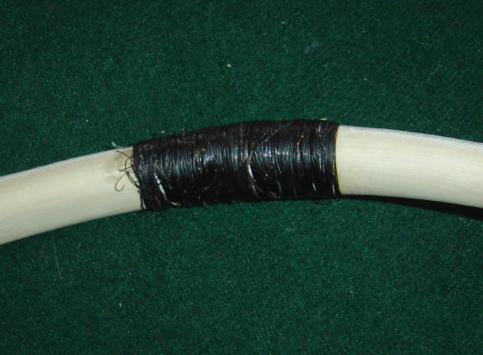nasser Rohhautstreifen am Ende der Pferdehaarwicklung, mit Kuhhaaren befestigt