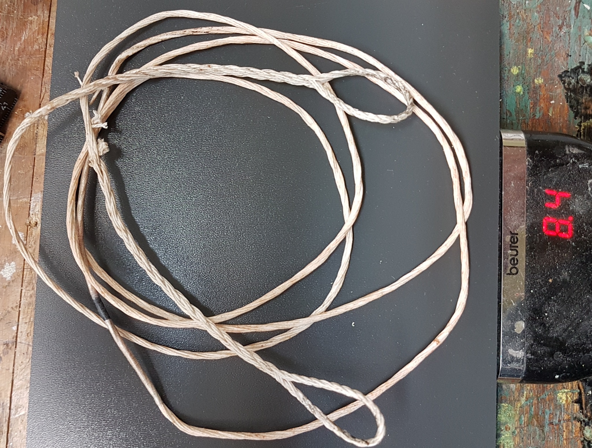 Aus dem 18/3 habe ich eine 16 Strang-Sehne gebaut, also theoretisch 342 pounds - die wiegt übrigens moderate 10,6 g. Auf einem 80 pounds Bogen aufgespannt dehnt sich praktisch nix (das Garn wird mit ca. 3% Bruchdehnung angegeben) und die Sehne hält zumindest mal die Standhöhe aus,was ja schon mal positiv ist.
