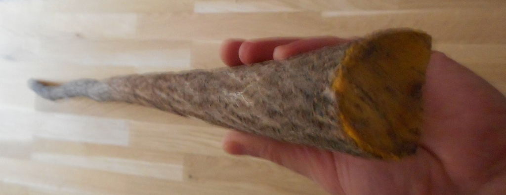 Den Hollunder den ich hier vor einiger Zeit gezeigt habe habe ich mangels Bandsäge mit der Flex (raucht wie sau ;D ) angeritzt von beiden Seiten und dann gespalten. Der spalt wollte anfangs gerade bei der dünneren Hälfte öfters verlaufen allerdings habe ich es dann doch geschafft.