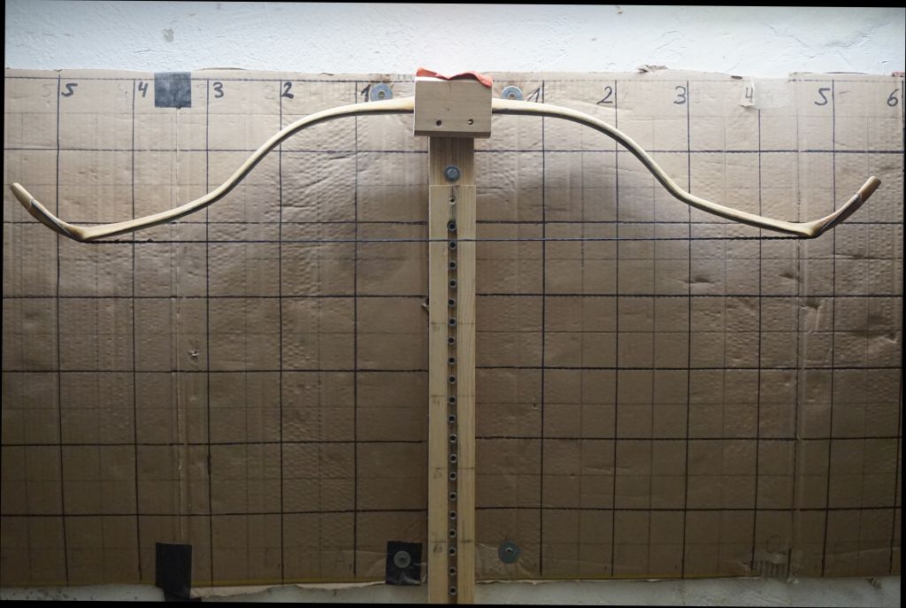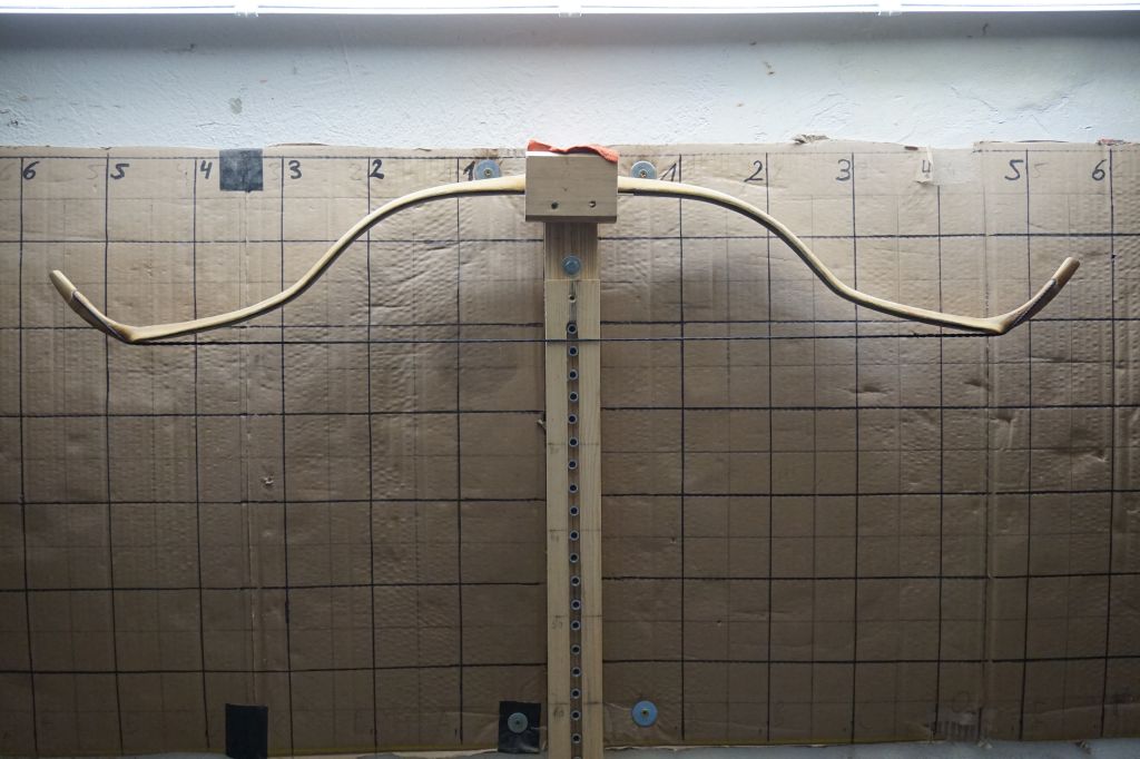 nachdem der Bogen über Nacht aufgespannt war, zeigte sich deutlich, dass der rechte Wurfarm noch zu stark war. Der Bogen hatte einen Schiefstand
