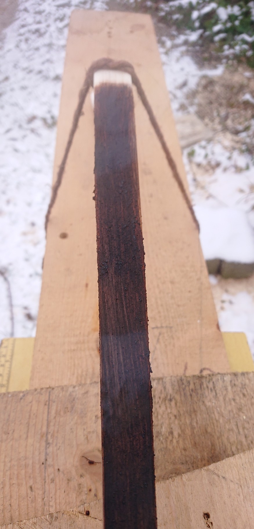 Ich finde es sehr schwer die Verfärbung des Holzes mit dem Harz Wachs Terpentin Gemisch einzuschätzen... Ok war auch erst meine dritte Hitze Behandlung....