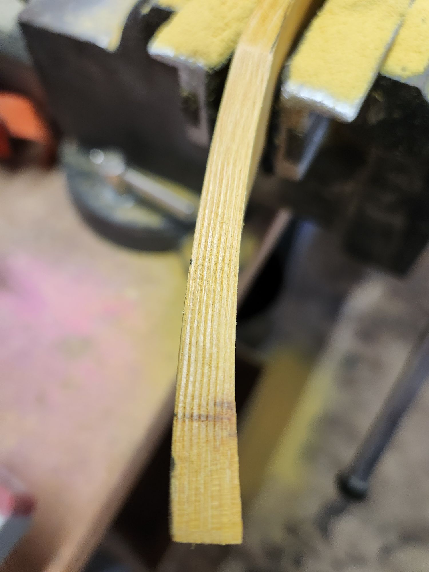 Auf diese Art gibt es einen sanften Übergang zwischen Griffholz und Kern. Prinzipiell ist das die gleiche Methode wie beim ausbessern von z.B. kleinen Bereichen mit Stauchbrüchen, nur dass hier etwas in die Rückenseite eingepasst wird. Ich hab sowas bei einem Bogen im Rahmen des Saplingbow 2022 bei einer Bruchstelle rückenseitig gemacht.