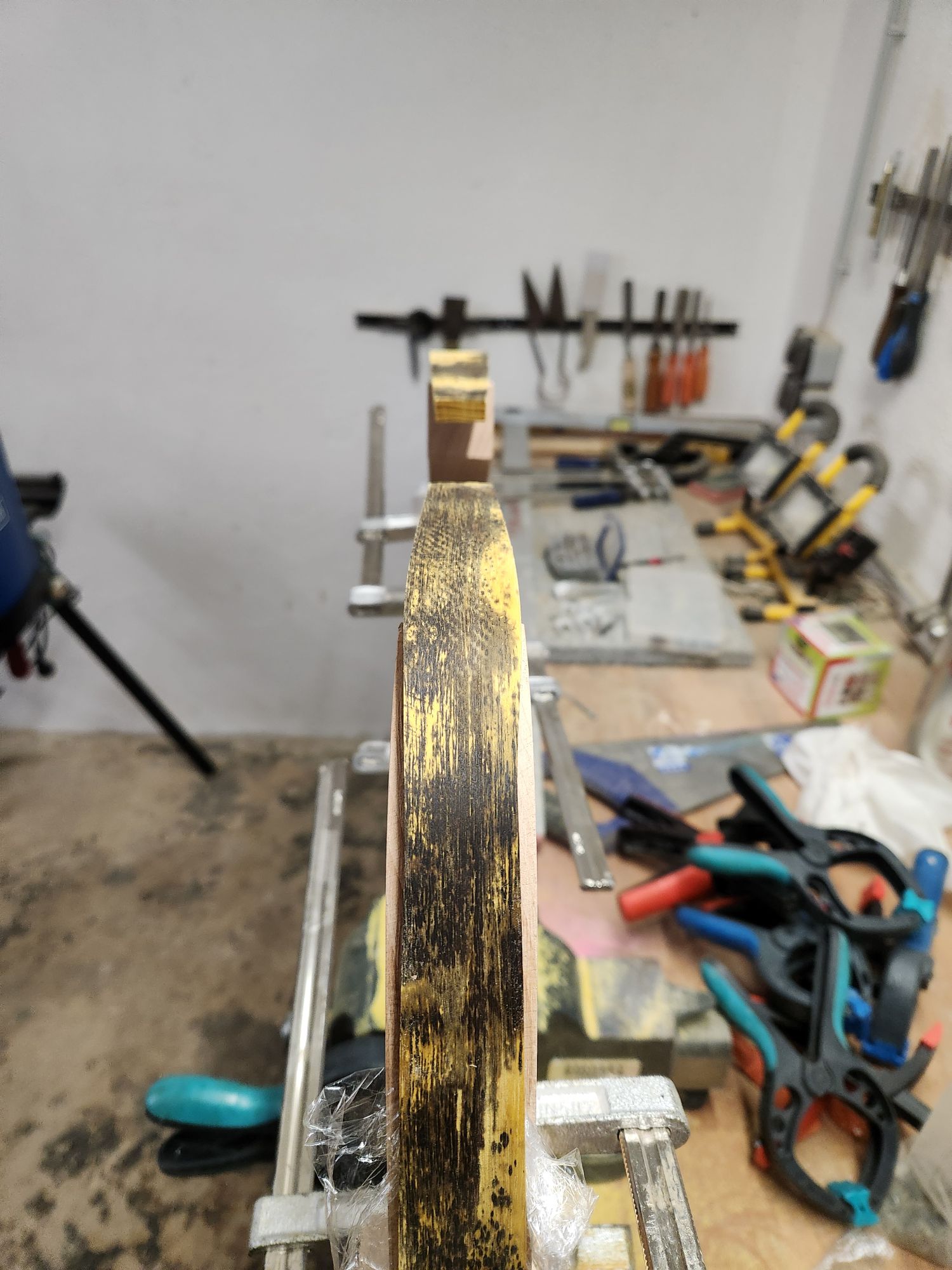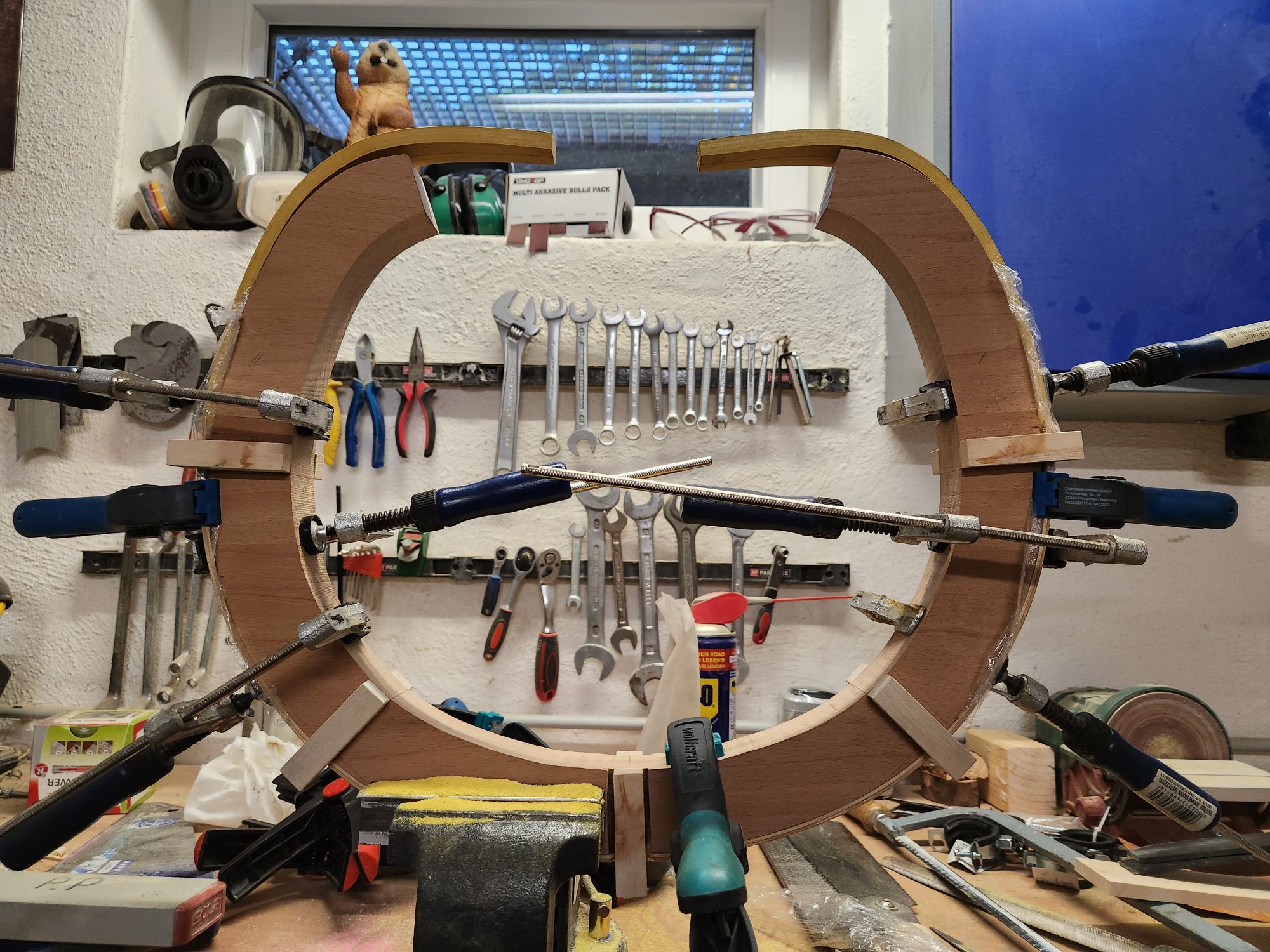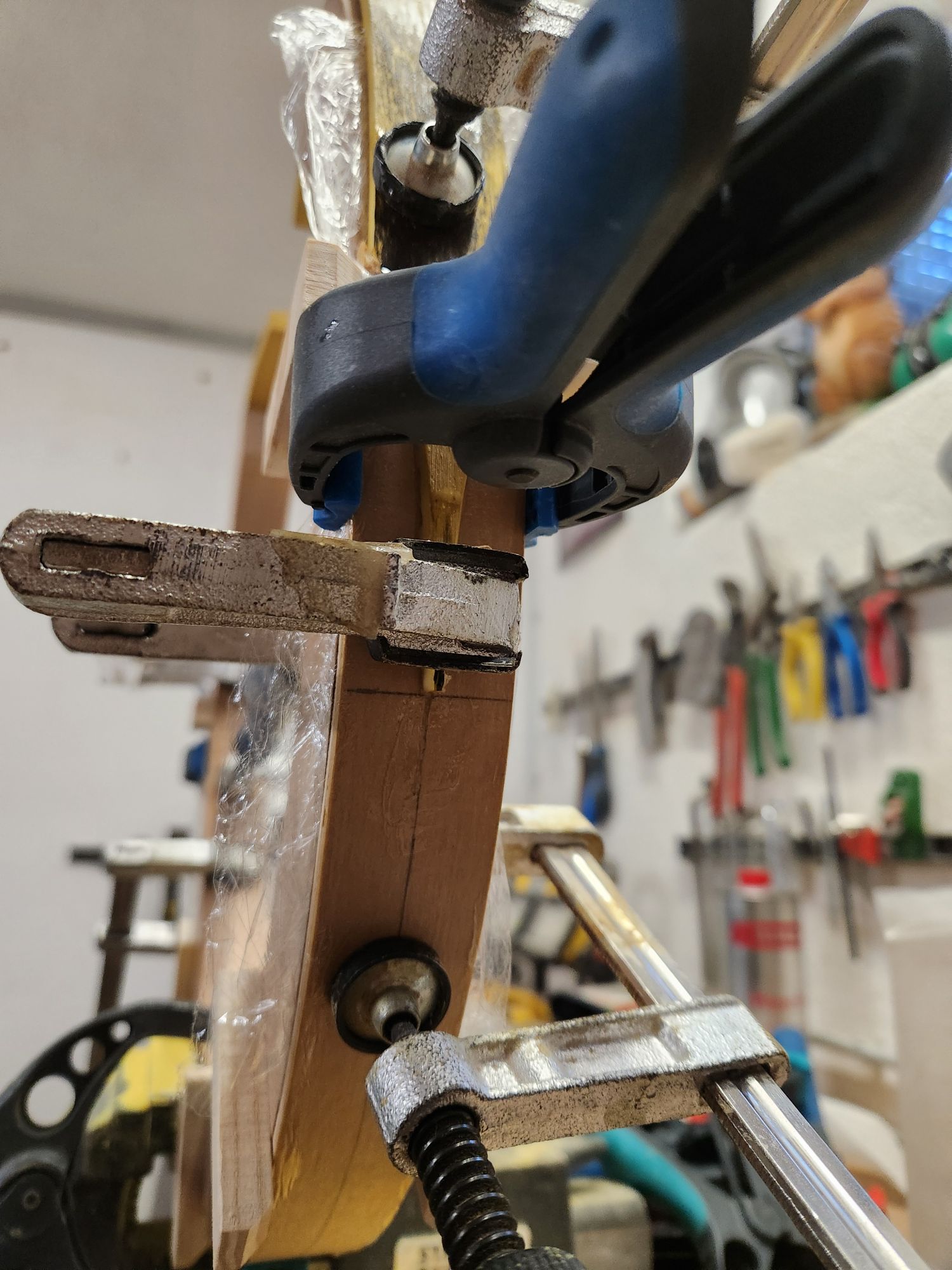 Und da die Zentrierkeile bei meiner Laminierform zufällig an der perfekten Position liegen hab ich beschlossen die Form auch fürs kleben der Spleiße zu verwenden. Die Laminate sind ja kaum schmäler als die Form weshalb das aufspreizen des Spleißes beim zusammenstecken schon reicht dass die Zentrierkeile druck auf den Spleiß ausüben. Die Schraubzwingen sollen vermeiden dass die Teile auseinander rutschen und richten alles passend aus. Momentan fluchtet alles perfekt. Ich hoffe das bleibt so wenn der Rahmen aus der Form kommt.