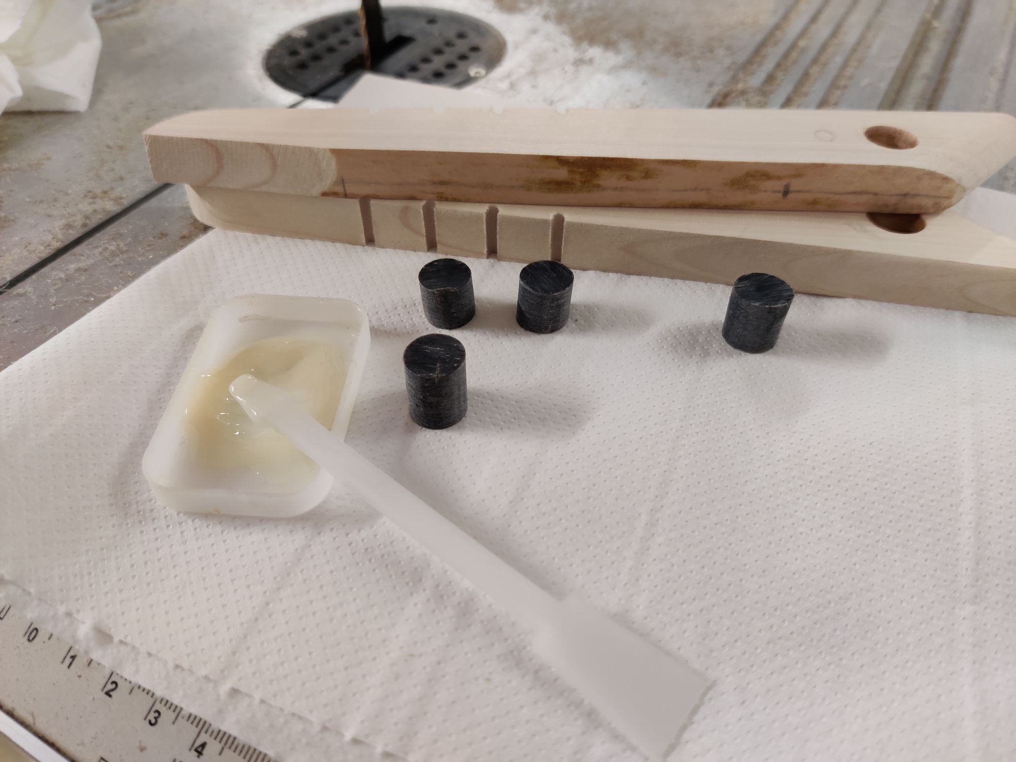 Heute hab ich alle zu klebenden Oberflächen frisch angeschliffen, gereinigt und die Hornbolzen in einzelne Stücke geschnitten.
