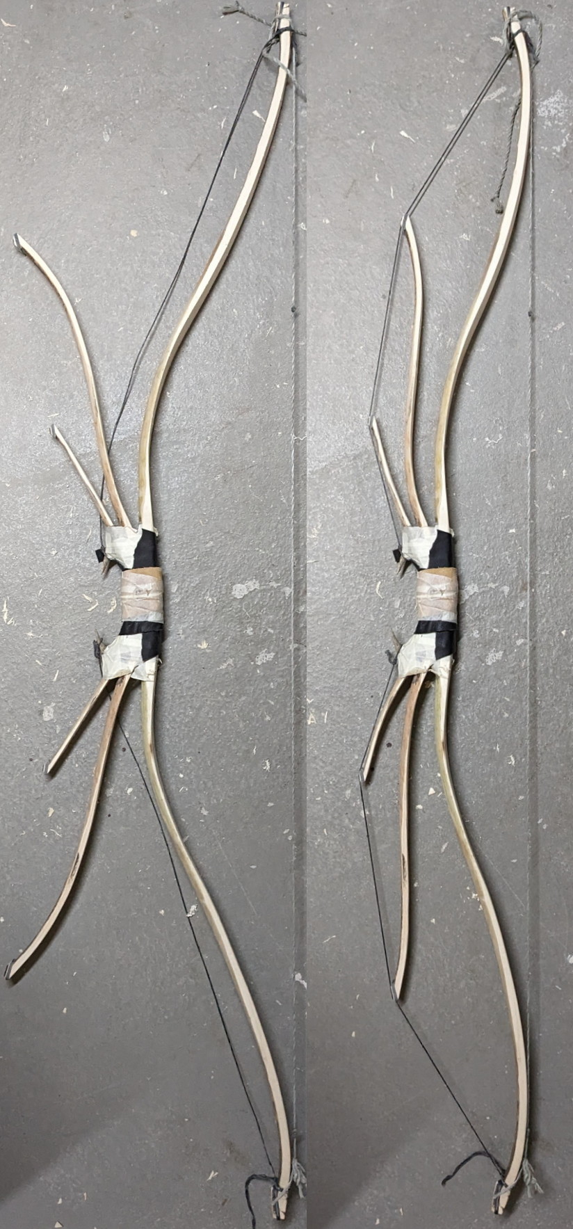 Jetzt muss ich mich schnell entscheiden, ob ich einfach weiter schwäche oder ob ich den mittleren Bogen etwas kürze, den recurve reduziere und somit das Kabel näher an den Rücken holen. Vielleicht ist meine Theorie aber auch falsch und durch das kürzen mache ich den mittleren Bogen und damit das Gesamtkonstrukt, nur stärker