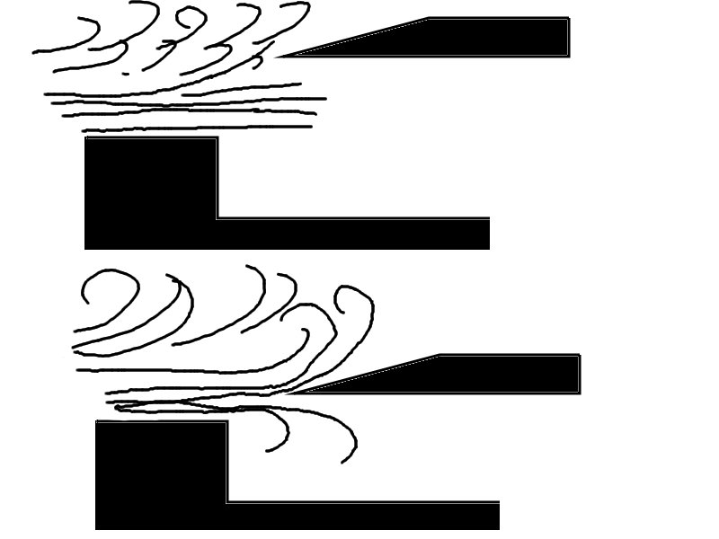 Ich hab das jetzt auch endlich mal in einer Zeichnung verpackt... Im oberen Teil der Zeichnung liegt das Labium zu hoch. Es treffen hauptsächlich chaotische Luftströmungen auf, der Luftstrom unterhalb des Labium ist sehr "Massiv" deshalb kann sich keine geordnete Schwingung einstellen, denn der Massive Luftstrom ist gelinde gesagt "bewegungsfaul"