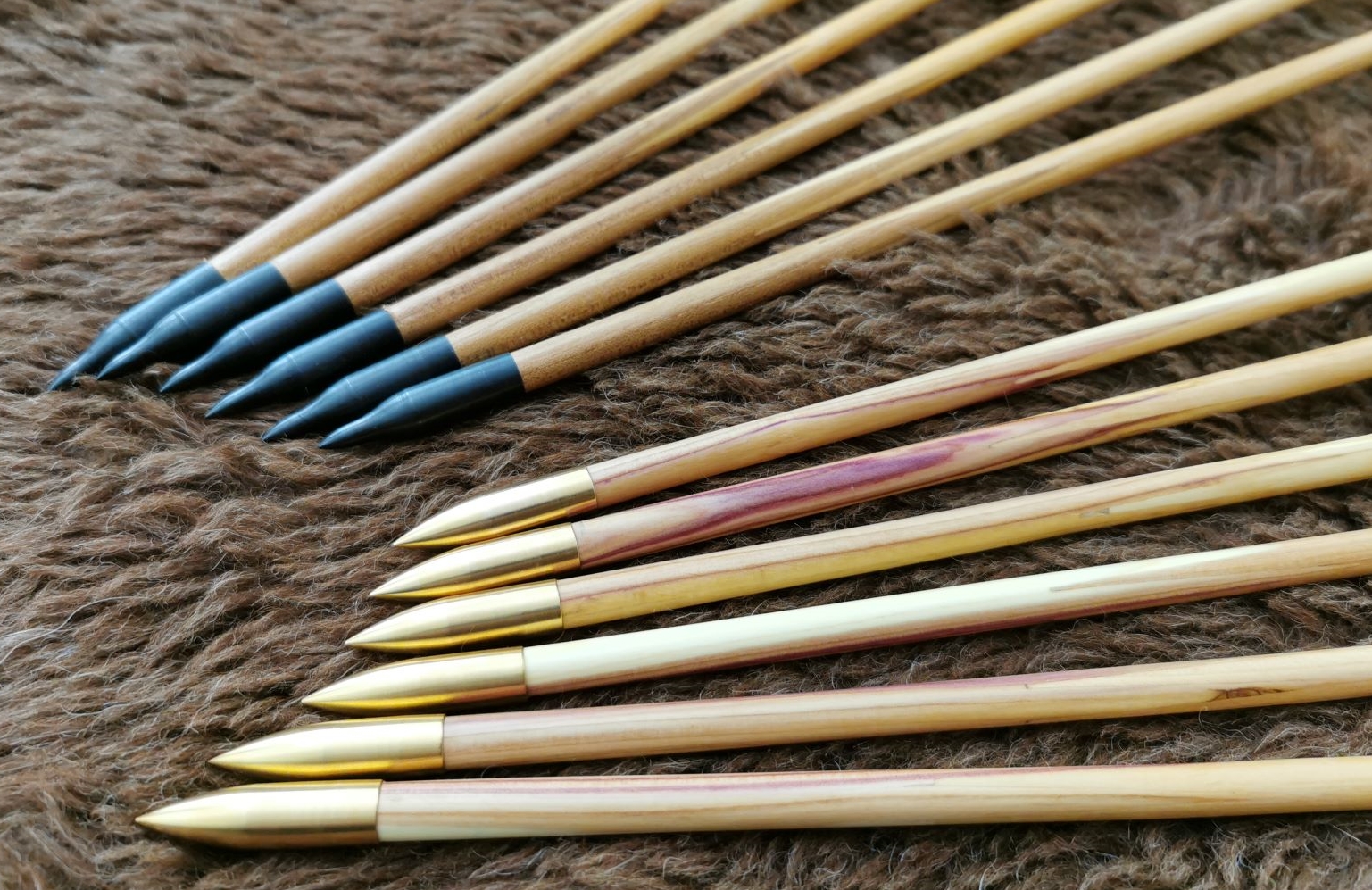 Die Zederschäfte wurden mit Vorschaft bestückt, die eine Hälfte aus Bergulme, die zweite aus Fliederholz. Darauf sitzen 70gn Schraubspitzen.