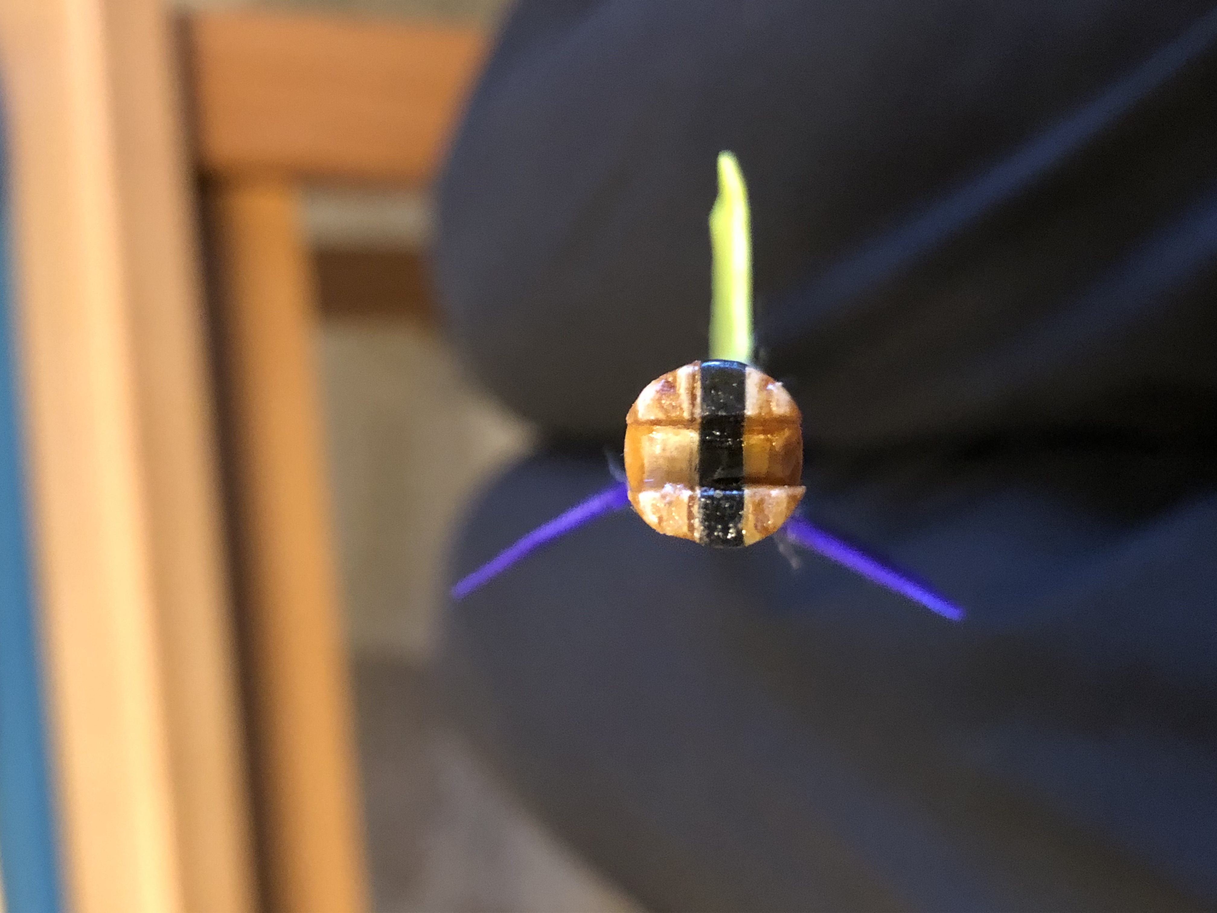 Die Wicklung und Spleisse der Befiederung ist ausgezeichnet und genau in meinen Landesfarben, gelb/blau.