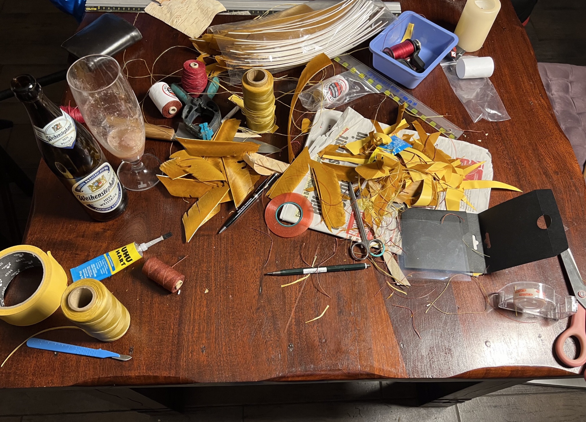 Bei den Pfeilen habe ich es mir auch unnötig schwer gemacht. Die Federn sind für meine Federstanze von der falschen Flügelseite. So musste ich alle Federn mit der Schere zurecht stutzen. Die großen V Nocken passen nicht in das Befiederungsgerät und so habe ich alle Federn Freihand aufgeklebt. Selber Schuld. Morgen noch die Bogensehnen und dann Fotoshooting