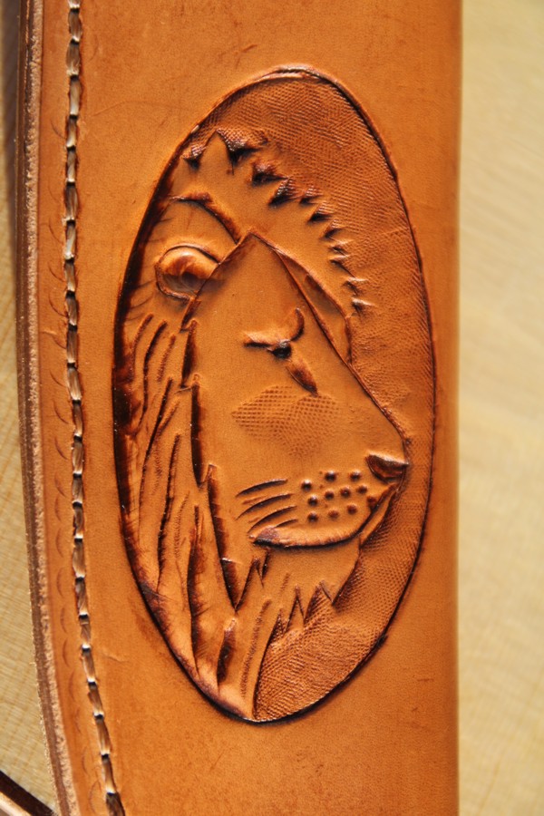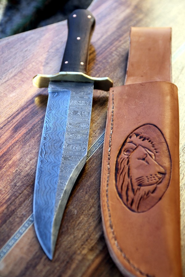 Klinge von Knifesupply, Griff Ebenholz im Coffin-Style wie um 1870 en vogue, vernietet mit Kupfer, zusätzlich mit Epoxy verklebt. Parierstange, Messing von Hudson's Bay. Scheide aus vegetabilem Rindsleder, Punziertes Löwenmotiv (inspiriert von Aslan -Narnia)