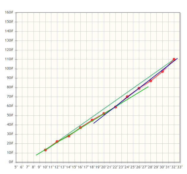 Blacky hat gestern 2 Auszugsdiagramme seiner Bögen gezeigt, und man kann dort durchaus erkennen, das es an einem bestimmten Punkt zu einem sichtbaren Anstieg der Steigung der Kurve kommt. Das interessante daran ist, das die Kurve zuerst Linear ansteigt mit einer Steigung von x, und dann kommt es bei run 20-22" Auszug zu einem "Knick" und die Steigung vergrößert sich etwas, läuft dann aber weiterhin linear, nur mit größerer Steigung.