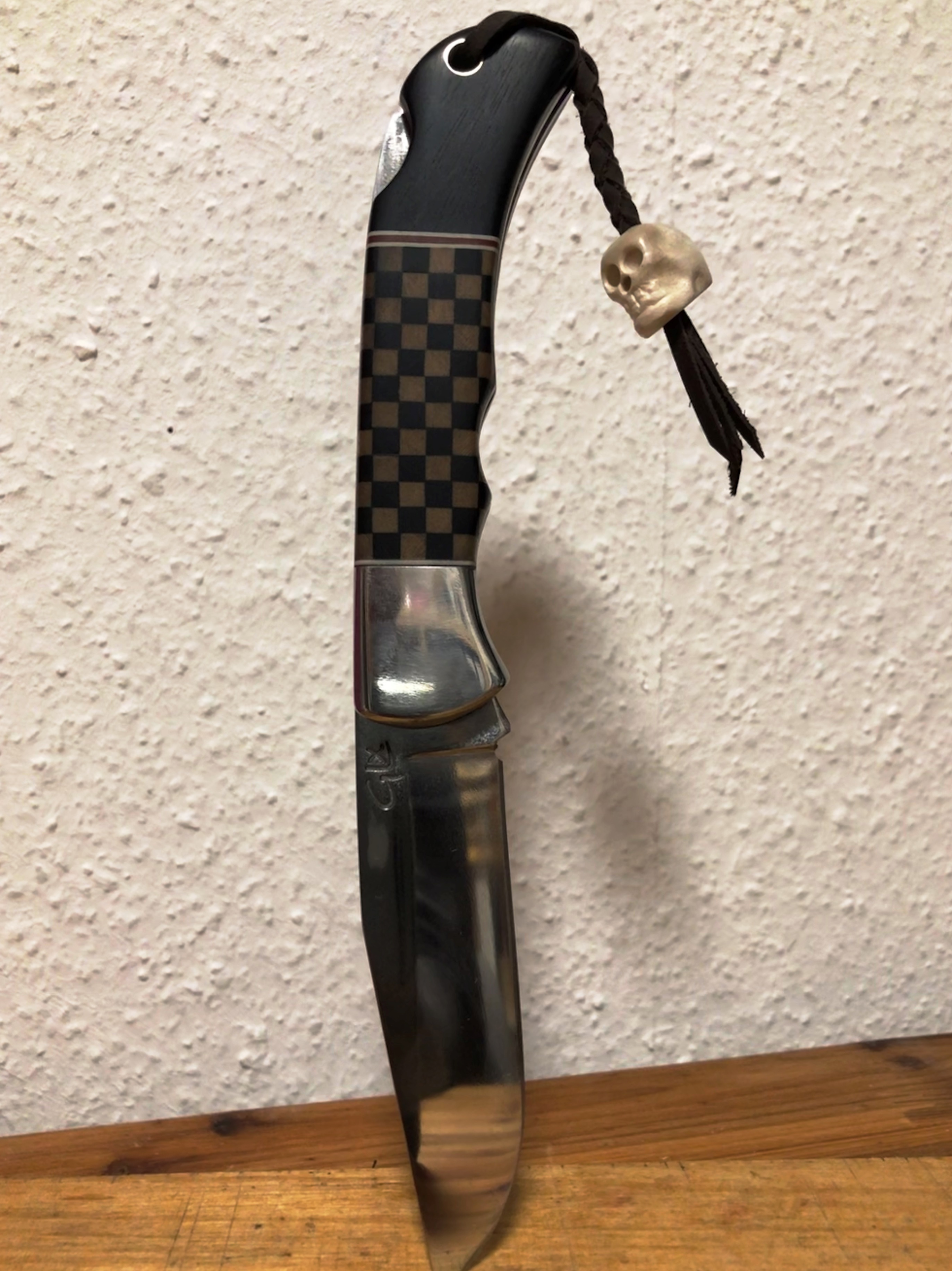 Sehr ansprechend finde ich die Grifform und ich halte sie auch für ergonomisch gut, prima auch, dass die untere Ecke der Klinge rund geschliffen ist, das minimiert die Verletzungsgefahr (ich hab mir an einer solchen Ecke schon mal böse wehgetan und in meinem Zorn das Problem dann mit dem Bandschleifer gelöst