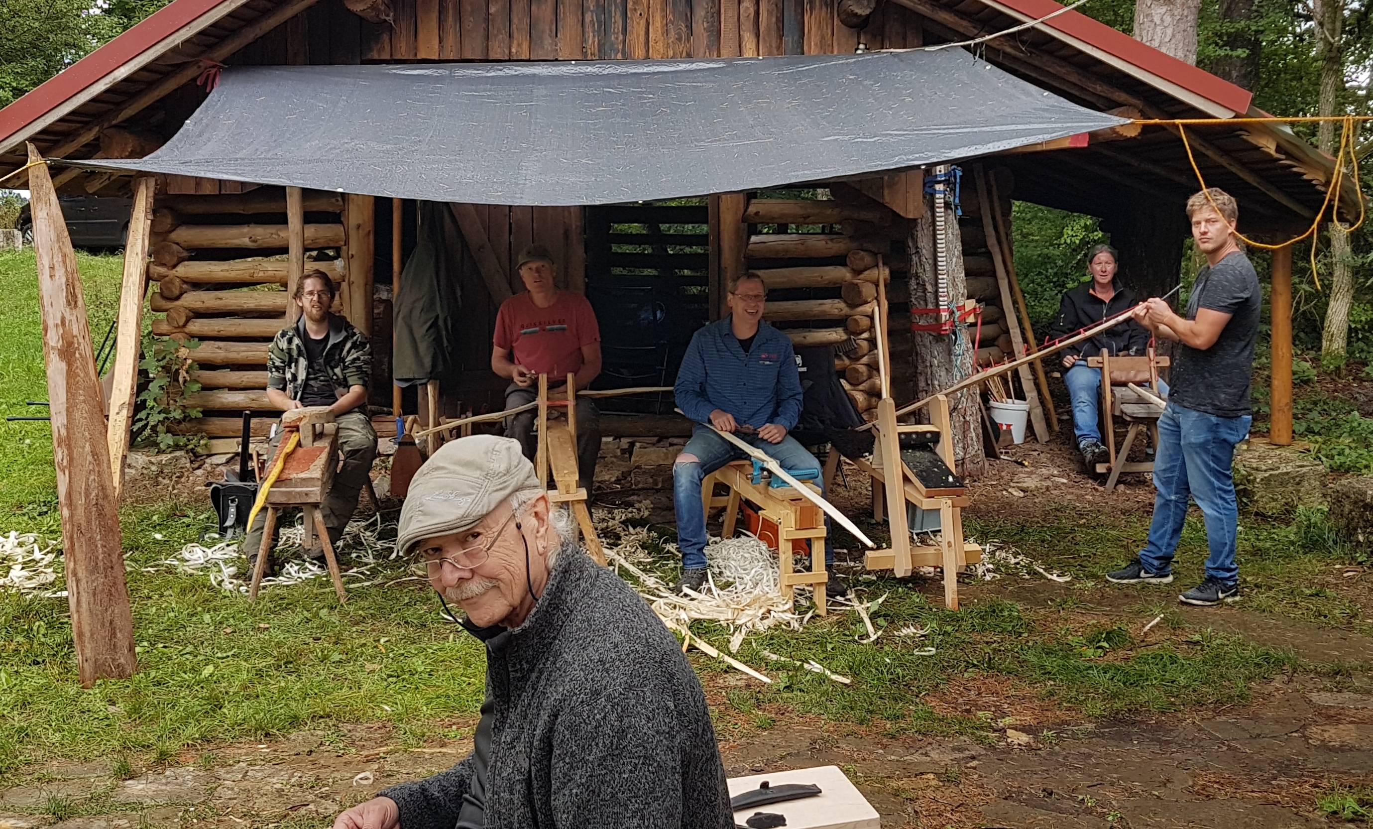 Kaum angekommen, wurden wir zur York-Runde verhaftet. Erst mal vermessen. Der Bogen wird an Neumis sensationellem Bogenständer geparkt. Neumi zerschießt gleich mal seinen niegelnagelneuen Scheibenständer auf 100 yards. Die ersten Treffer stellen sich ein! Auch Neumi trifft wieder. Perfekter Querstrebentreffer! Die gemütliche Behausung. Verpflegung für die Bogenbauer. Die wichtigste Verpflegung für Bogenbauer! Was köchelt denn da? Neumi, Spanmacher und Sanne passen auf den Topf auf. TomTom, der Chefkoch, rührt mal um. Es duftet herrlich! Ein leckeres Rehgulasch erwartet uns! TomTom, Wazuka_Filius und MrCanister123 im angenehmen Gulaschkoma. Theron bringt seine nasse, unzerstörbare Linde in den Vollauszug. Wazukas Linde hat nur zwei Schüsse überlebt. Die Reste werden den Göttern übereignet. Samstag abends beim gemeinsamen Grillen. Lagerfeuerromatik (ich liebe es!). Neumi hackt Holz unter den kritischen Blicken von Fatz und Spanmacher. TomTom sinniert (?) und Wazuka_Filius schaut glücklich. Sanne scheint auch etwas skeptisch ob Neumis Holzhackerfähigkeiten. Theron läßt sich von F'al Gran was zeigen. Und zum Abschluß wird noch eine Testrüstung auf Schußsicherheit getestet. Treffen ist natürlich Voraussetzung für den Test. War aber eher selten ...