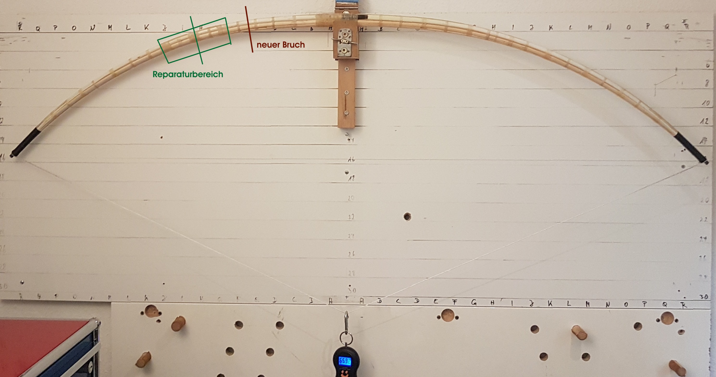 Immerhin, das höchste im Bild festgehaltene Zuggewicht ist 66,4# (vorher gab es schon einige Knister- und Knackgeräusche, also kann man auf ein höheres Zuggewicht schließen) und immerhin hat das Konstrukt 3x die 32" Auszug überlebt