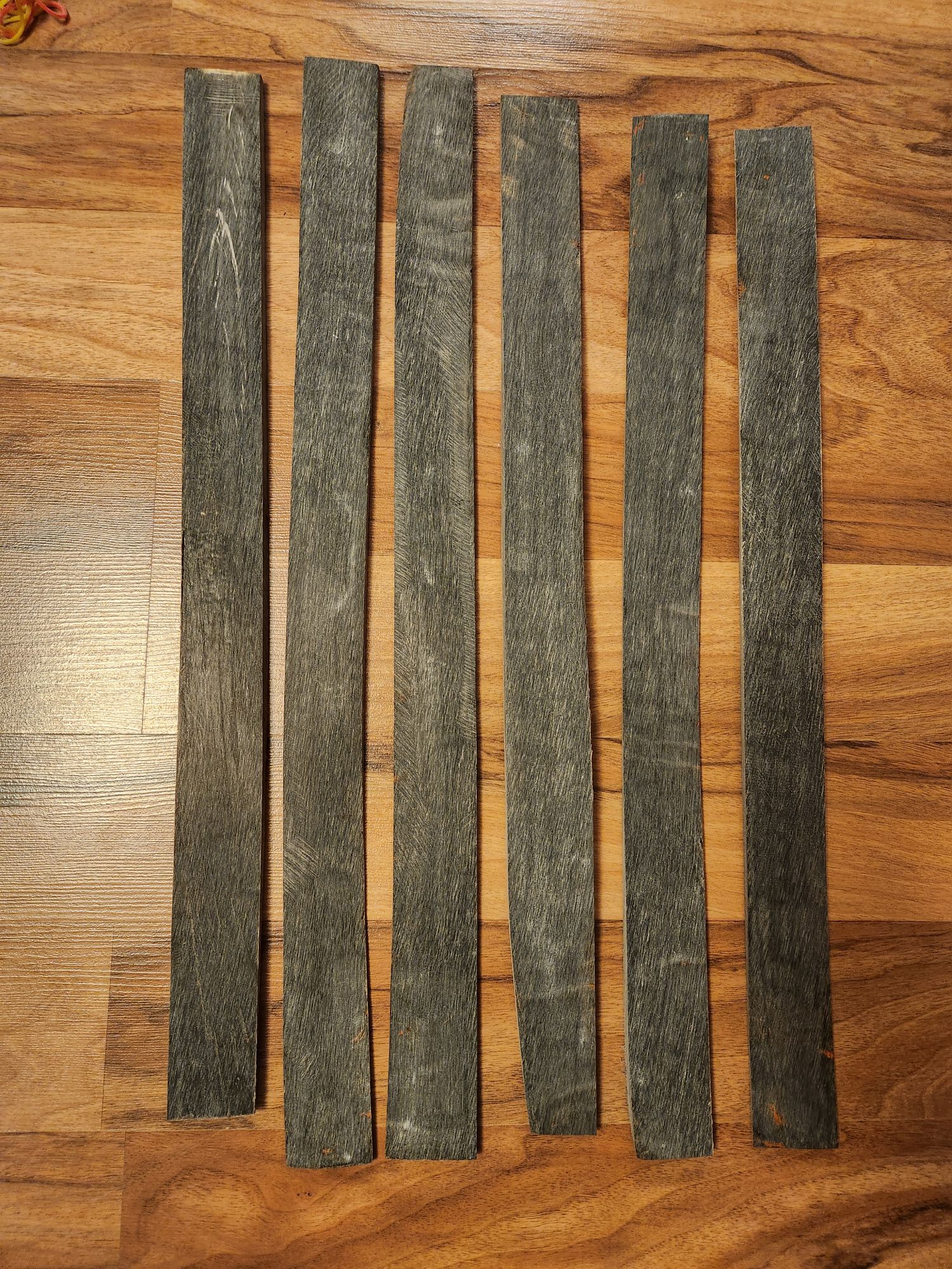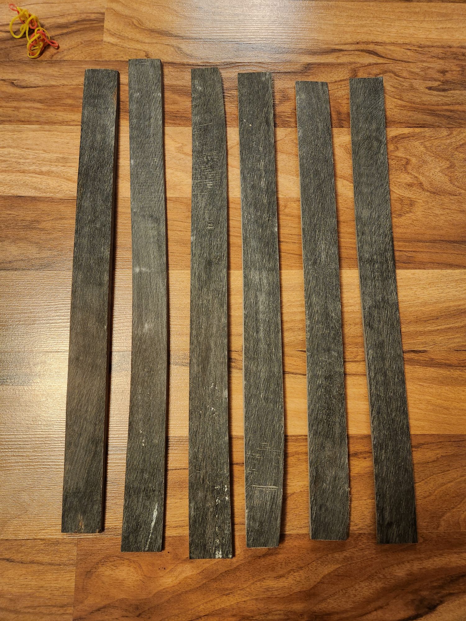 Eine dritte hab ich dann trotzdem noch aufgetragen. Dann hab ich die eingeweichten Sehnenbündel ausgepresst, auf einem beschichteten Brett gekämmt, mit dem Leim betupft und erneut gekämmt. Das hat super geklappt. Der Leim hat keine Klumpen gebildet und ich hab die Sehnen aber aufgelegt ohne auf das gelieren zu warten. Unmittelbar vorm auflegen hab ich nochmals den Bogen grundiert. Die langen Bündel hab ich vom Fadeout bis vorm Recurve aufgelegt und das kurze Bündel danach über den Griff mit einem ordentlichen Überlappungsbereich.