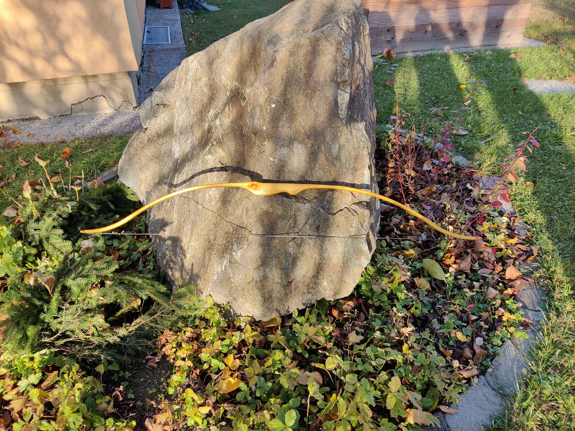 Ich hatte jetzt noch einige Zeit damit zu kämpfen dass der Bogen mit Schnur zwar gerade aussah, aber mit freiem Auge nicht. Ich hab dann festgestellt dass man das am besten auf einem Foto sichtbar machen kann, indem man von weit weg mit 10x Zoom die beiden Recurves in eine Linie stellt. So sieht man dass der Wurfarm links und rechts unterschiedlich weit über die Recurves übersteht.