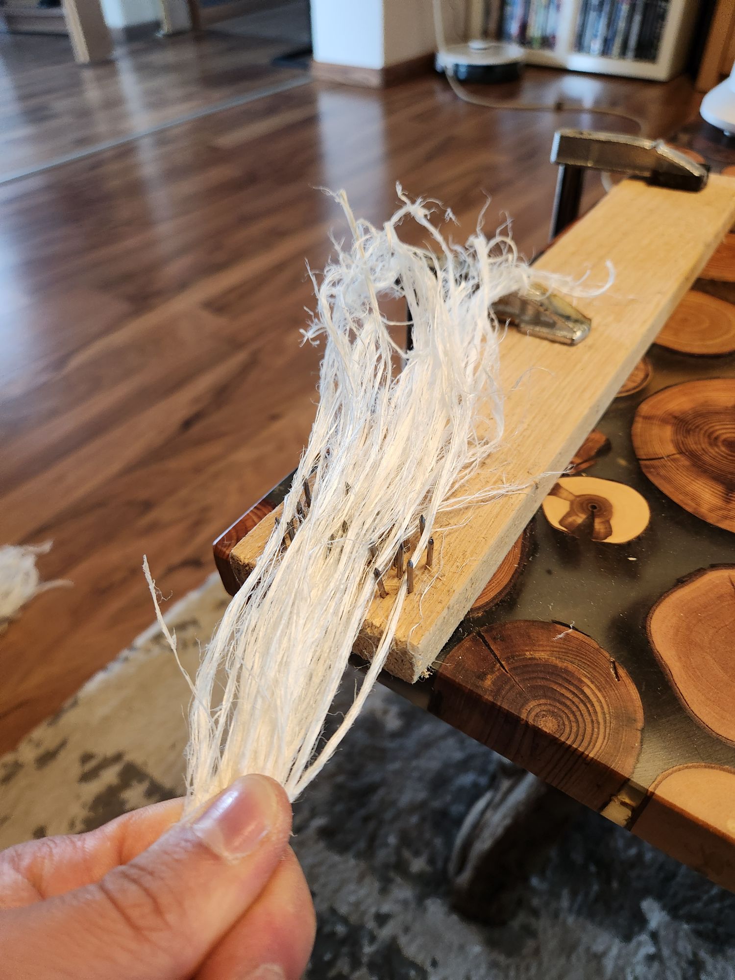 Währenddessen hab ich die Sehnenbündel noch gekämmt und nach Länge sortiert. Von der Sehnenmenge her hab ich mich nach Neumis Angaben orientiert. 2 Bündel mit 40cm Länge und je 9g schwer und 1 Bündel mit 30cm und 6g.