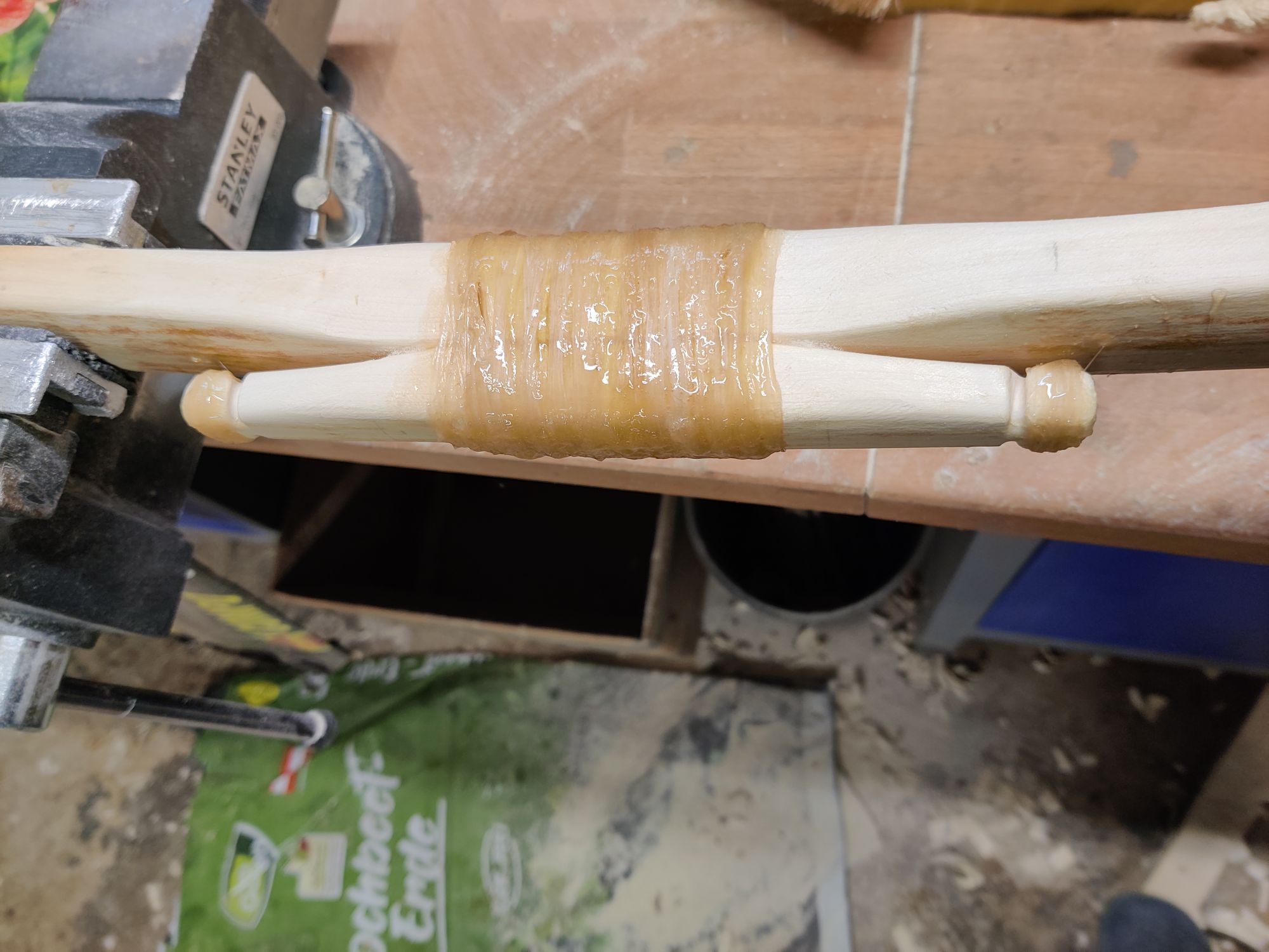 Gestern am Abend hab ich noch eine 25%ige Mischung Hautleim zum Quellen in den Kühlschrank gestellt und heute morgen gleich den Griff ausgeformt (geht ja danach nicht mehr) dann Sehnen eingeweicht und alle Wicklungen gemacht. Zuerst die ganzen kleinen Wicklungen und dann alles was an Sehnen übrig war im Griff. Als ich dachte fertig zu sein und schon wieder begonnen hatte wegzuräumen fiel mir auf dass ich die Wicklungen am Vorbogen vergessen hatte.