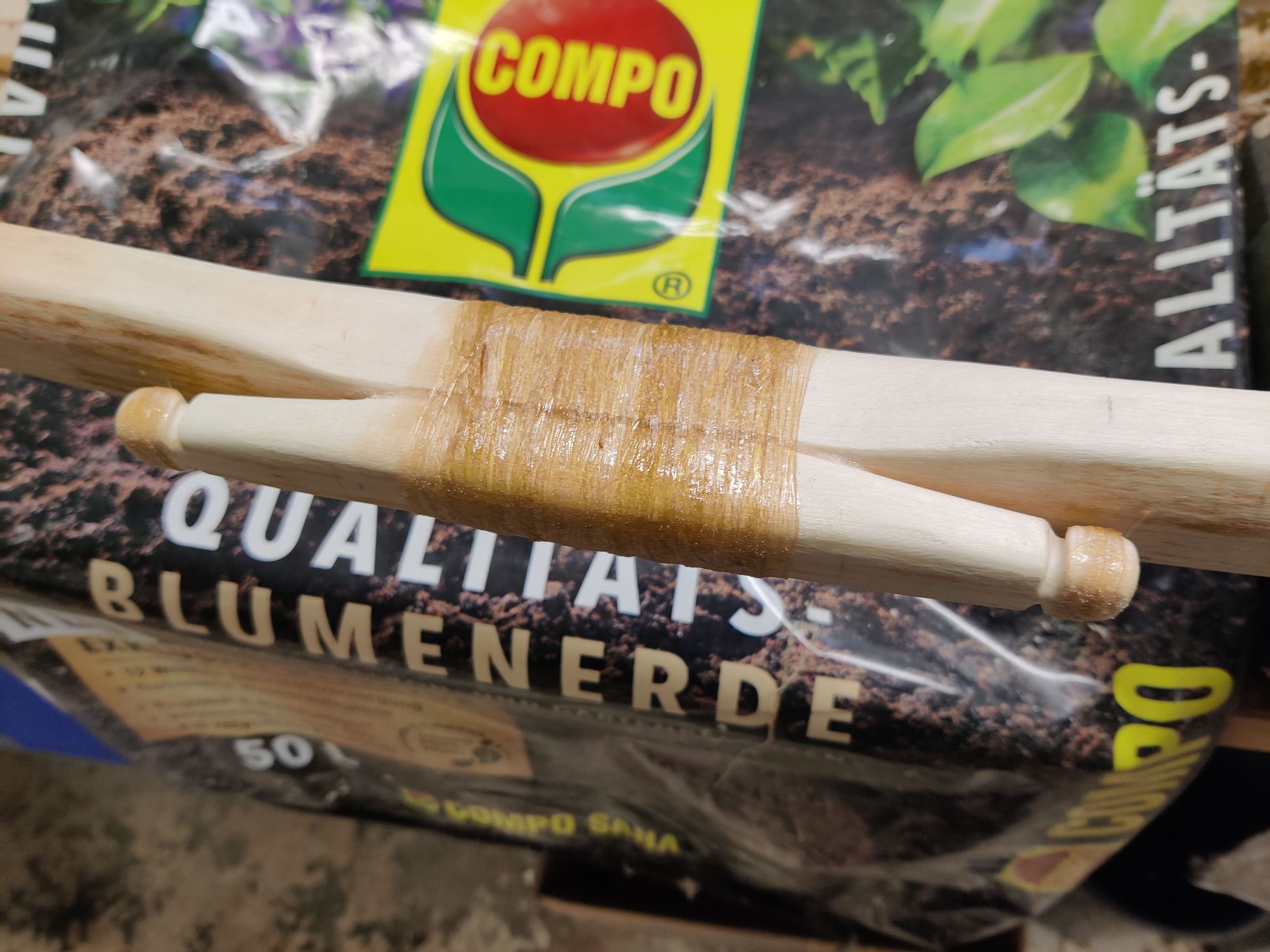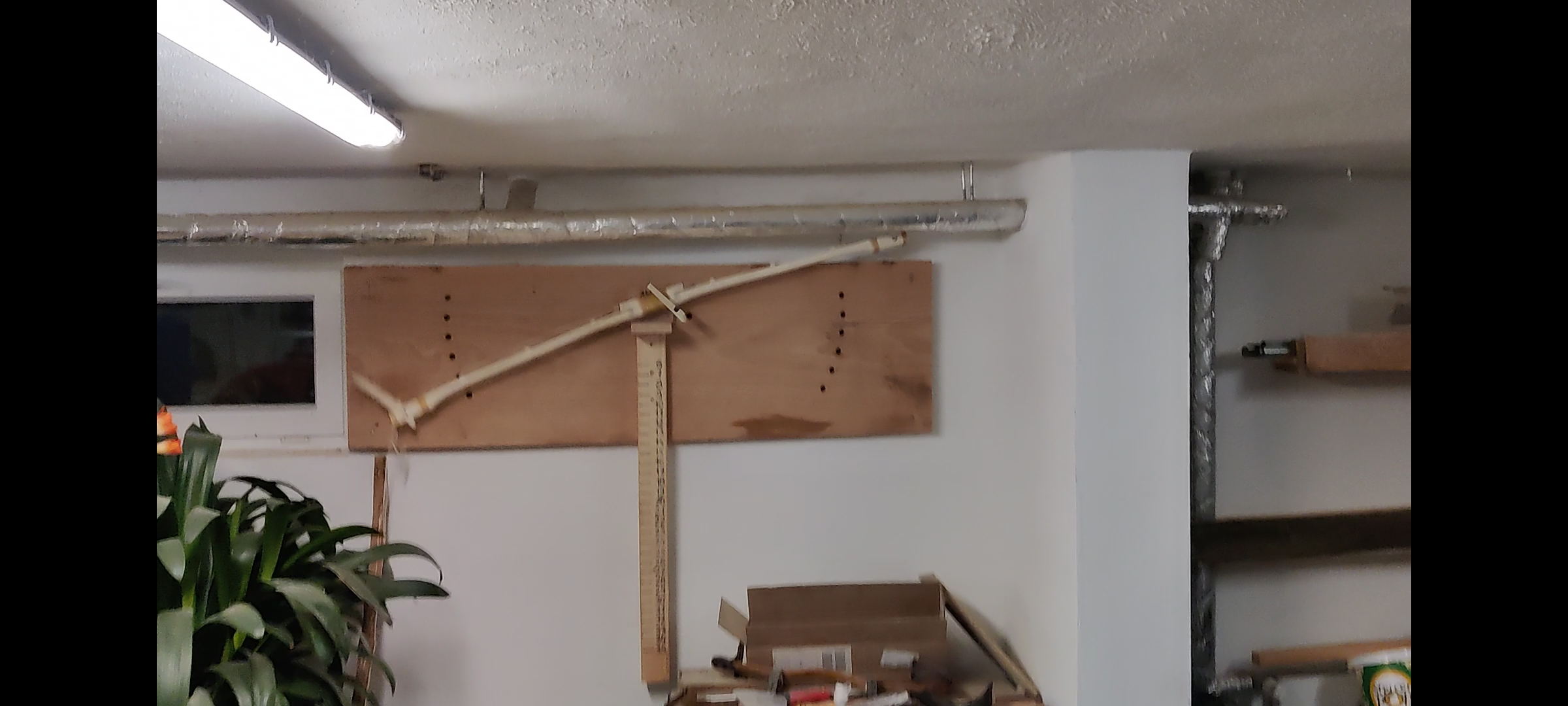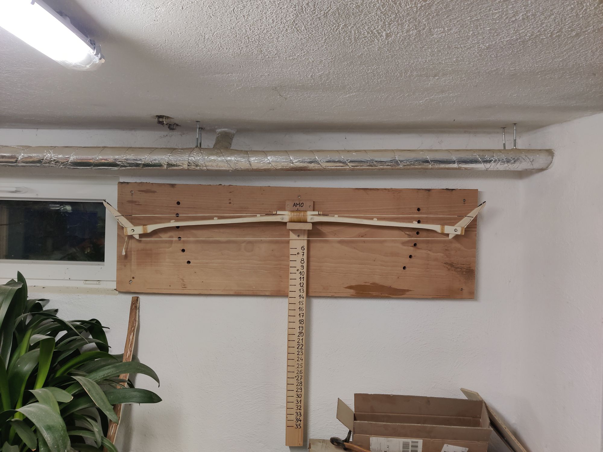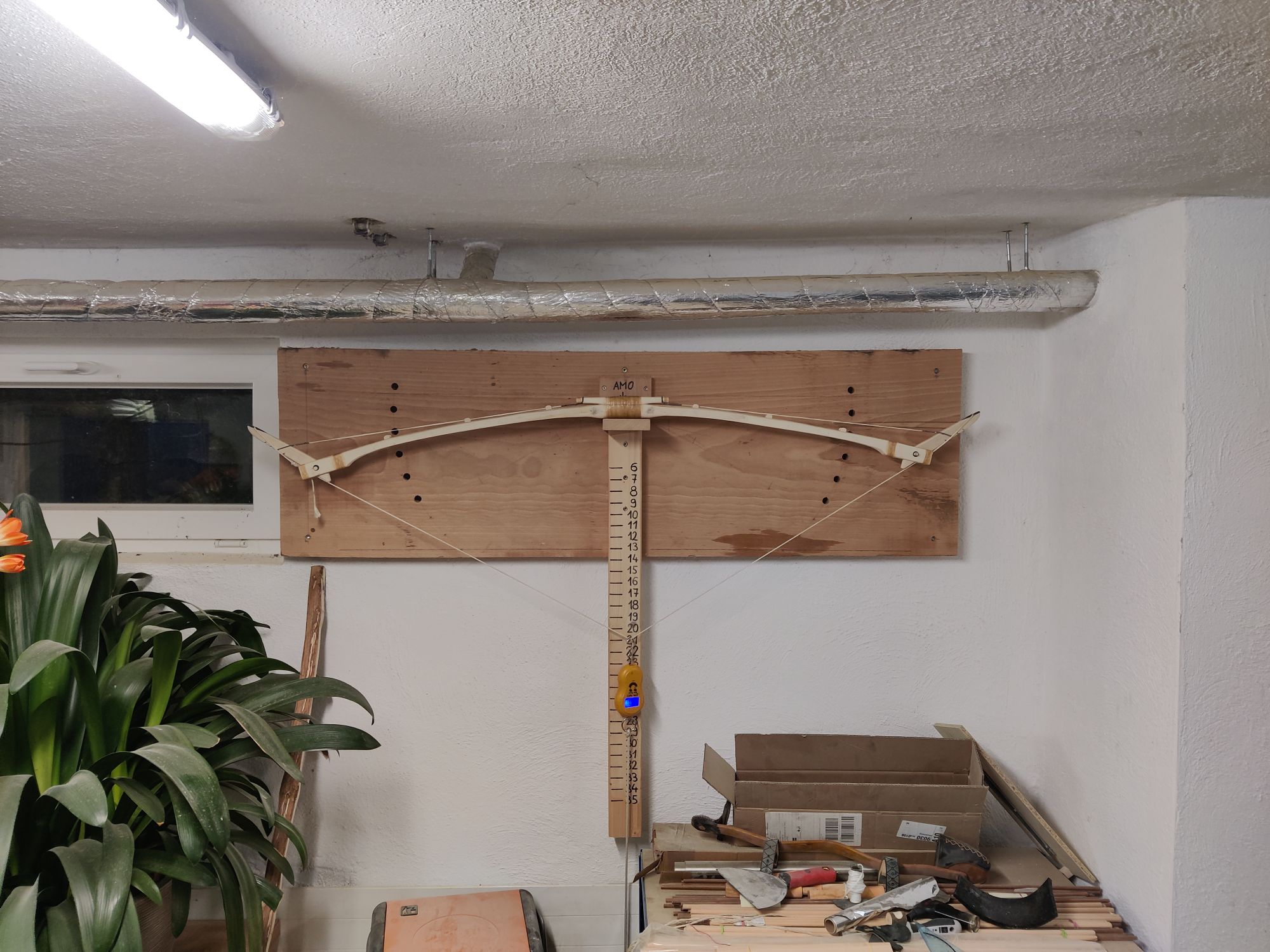 Damit war der Bogen dann bereit fürs Tillern. Komisch dabei war dass der Bogen irrsinnig hart zu ziehen war, die Waage aber nur etwa halb so viel anzeigte wie es gefühlt war. Ich hab ihn also bis etwa 30# belastet und fühlte sich aber nach 50-60# an. Jedenfalls kam bei den 30# dann der Punkt wo die Sehne anfing sich vom Recurve zu heben und sobald die Sehne etwa 2cm Abstand zum Recurve hatte, klappte sich der Recurve schlagartig bis zum Anschlag aus. Dieser Moment kam natürlich nicht an beiden Recurves gleichzeitig. In dem Moment lies das Zuggewicht aber auch so Abrupt nach dass sich die Zuggewichtswaage jedes mal durch den Ruck zurückgesetzt hat