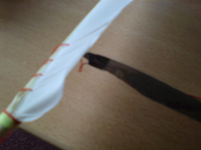 einen langen Streifen Papier schräg um den oberen Teil des Schaftes wickeln, da wo die Federn hinkommen.