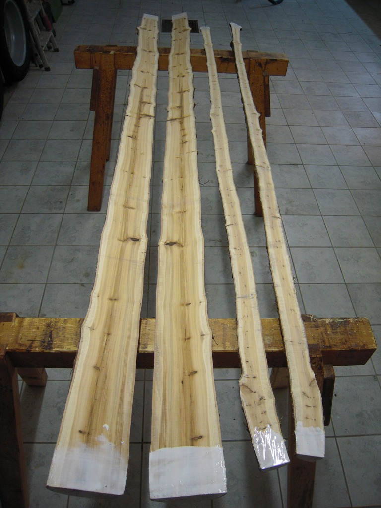 Habe gestern einen Eibenstamm mit ca. 4,5m Länge und wenig bis gar keinen Ästen im unteren Bereich ergattern können. Am starken Ende ca. 12cm Durchmesser. Der Stamm wurde von mir in zwei Stücke geschnitten u. danach mit der Bandsäge in je zwei Hälften geteilt u. mit Holzleim versiegelt. Jahresringe sind super. Habe bis zu 20 auf 1cm gezählt.
