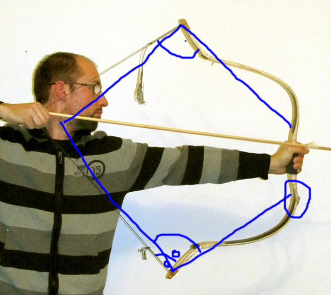 - Auf dem Auszugsbild ziehst du den Bogen weit über 90Grad Sehnenwinkel, also pumpst du mehr Energie in den Bogen als er noch effektiv abgeben kann, da der Hebel nicht mehr optimal unterstützt wird, auch wenn sich das bei einem Hornbogen noch relativ weich anfühlt. Den Bogen quasi nächstes mal mehr auf deine Körpergröße oder Auszugslänge anpassen.