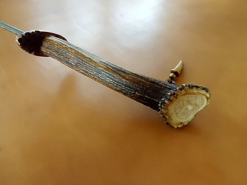 Hirschhornrosengriff mit graviertem Stern in der Rose, einer Baustahl Rundstange (stehe auf das robuste Aussehen und bei richtiger Pflege ist Stahl auch kein Problem ) und handgeschmiedeter Kupferparierstange, versehen mit ein bisschen Gebimsel aus Hirschhornspitze und Messingapplikationen....fertig.