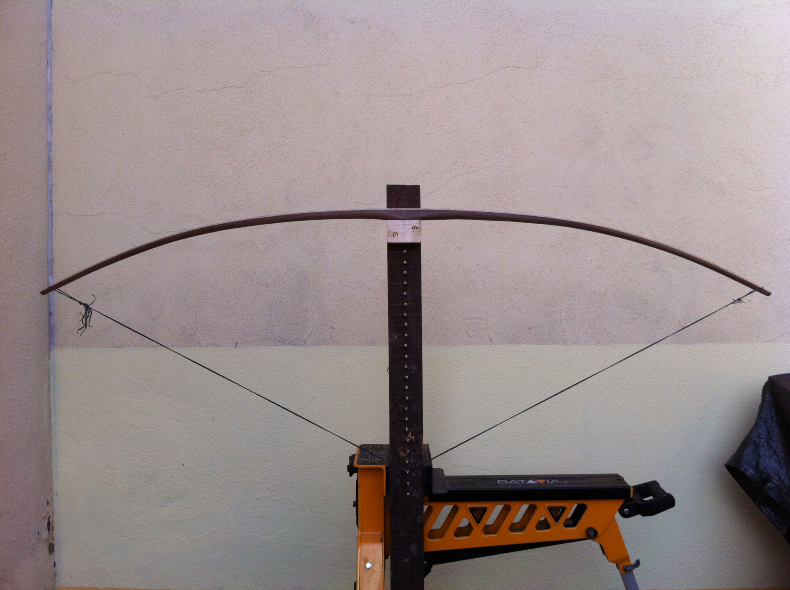 Arg viel lässt sich jetzt noch nicht sagen, außer dass die Biegung genau mittig in den Wurfarmen stattfindet. Somit könntest Du als nächsten Schritt Material vom Griff aus wegnehmen. Schön langsam, nicht zu viel, immer wieder das Holz zwischen durch anpumpen, damit es sich setzen kann.