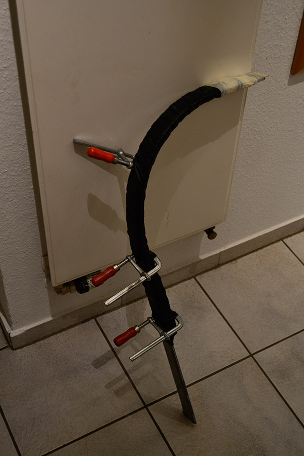 mit Schraubzwingen und halbiertem Fahrradschlauch fest (sehr fest) umwickelt.