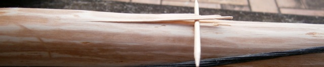 .. und by the way - der Blutegel ist doch nicht so zäh wie sein tierischer Namensvetter... Druckfest - ohja, auf alle Fälle, 100%. Wo's hapert ist die Zugfestigkeit: Die hauptsächliche Biegeleistung muss ja, durch die baulichen Massgaben, der obere WA leisten und da hoben sich bereits 2 Spänchen ab, die ich, wie man sieht, mit Dacron gewickelt habe... Gesten sprang nun gleich hinter dem oberen Fade ein SPAN raus.