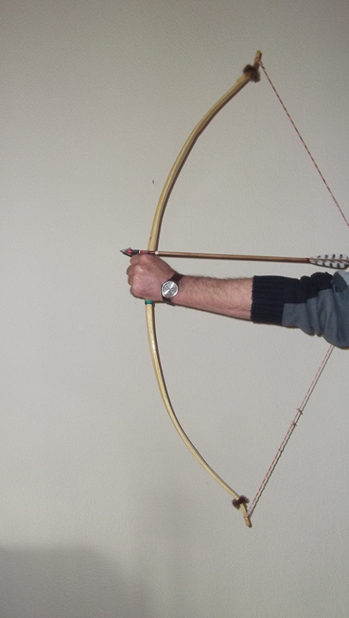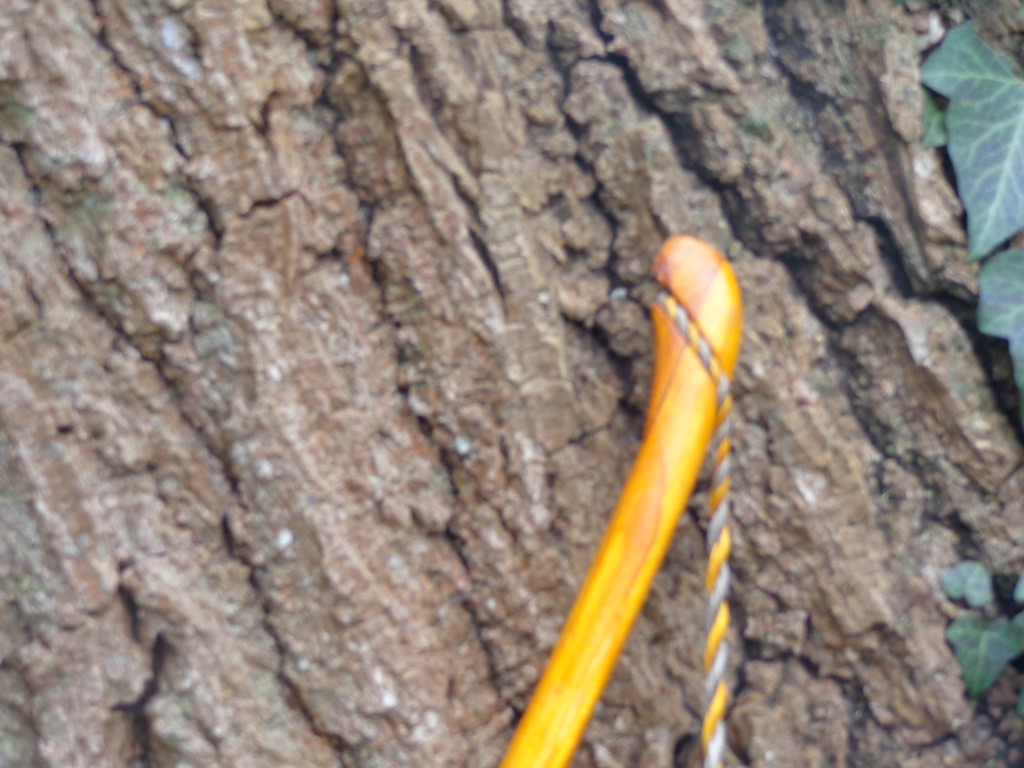 Der Bogen hat einen nahezu runden Querschnitt über die gesamte Länge und wurde von mir, ohne einen durchgehenden Jahresring am Rücken, vom Griff (mit Rinde D ca.25mm ) zu den Enden (ca. 6mm) heruntergeschnibbelt. Werkzeuge dafür: Ziehmesser, Schnitzmesser (um die Äste herum), Schweifhobel.