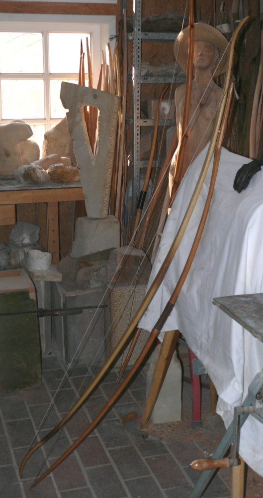 Bei meinem zweiten Bogen habe ich - ohne es besser zu wissen - alle tradierten Regeln ignoriert: Eschenbohle, kammergetrocknet, Jahresringe senkrecht, ELB-Profil... Die Fasern sind jedoch ausgesprochen gerade und die Länge NtN ist großzügig (190 cm). Auszugsgewicht: 35-40# @ 28". Experiment? Wie lang würde er normalerweise leben? Nach hunderte von Schüssen ist der Gute noch da, mit wenig Set und ohne Anzeichen von Knittern. Und wichtig: ich habe Freude daran...