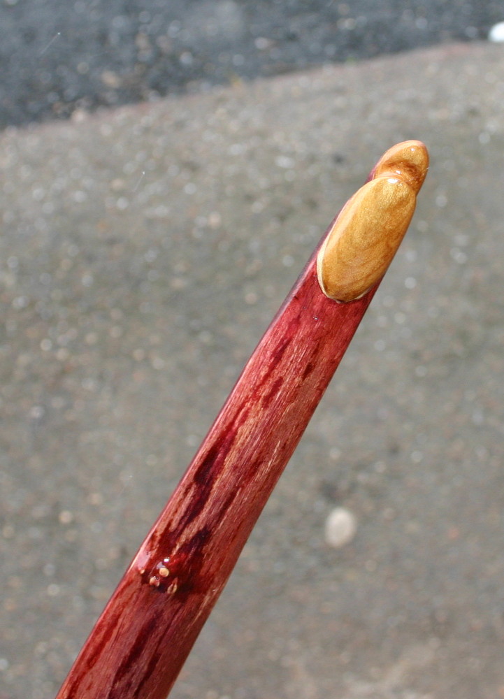 Meine Tochter meinte, ich solle doch mal die schon seit langem herumliegende Beize in violett ausprobieren. Gesagt, getan. Ich habe allerdings nur den Rücken gebeizt und danach die Beize mit feinem Schleifpapier leicht angeschliffen. Darauf gab es dann drei Schichten Schellack. Das Ergebnis ist gar nicht schlecht, mir gefällt´s. Das Einzige, was nicht so schön ist, sind die leicht vertfärbten, angegammelten Stellen im Markkanal. War aber noch im Frühstadium, das Holz ist fest und so sind es nur leichte Schönheitsfehler.