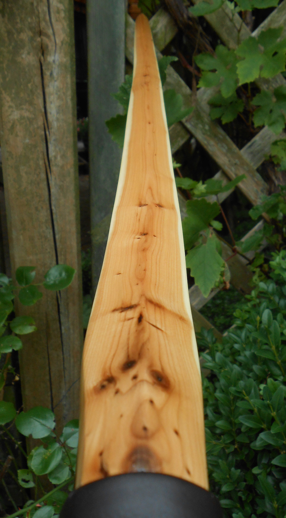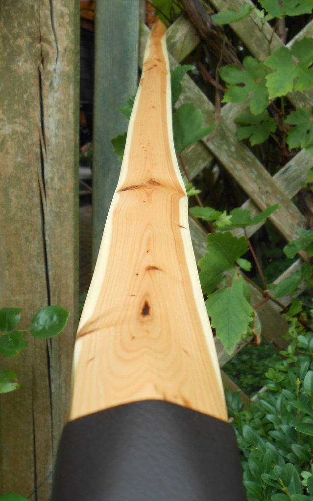 Das Verhältnis von Splint zu Kern ist eher suboptimal, aber der Rohling hat eben nicht anderes hergegeben. Wie schon zu anfang gesagt, waren die Enden ursprünglich mehr geflippt (mit Dampf), aber da ich den Bogen vertillert hatte, musste ich ihn kürzen. Daher sind die Enden nur noch geringfügig geflippt. Die Wurfarme waren von Anfang an ca. 2,5 cm reflex, daher hat sich das Burgunderprofil regelrecht aufgedrängt.