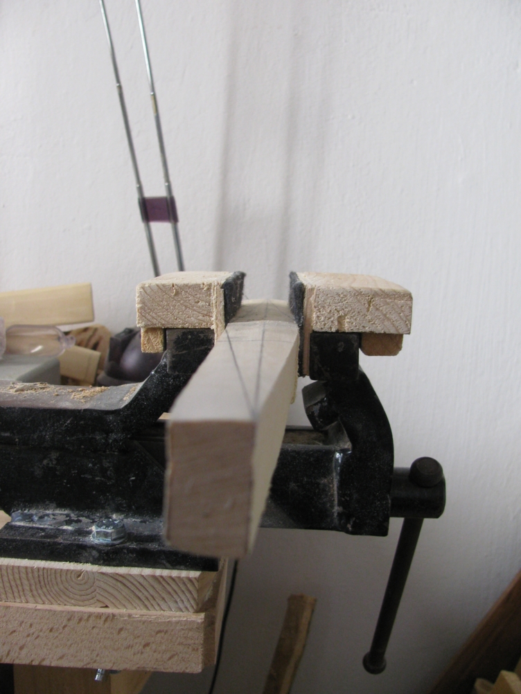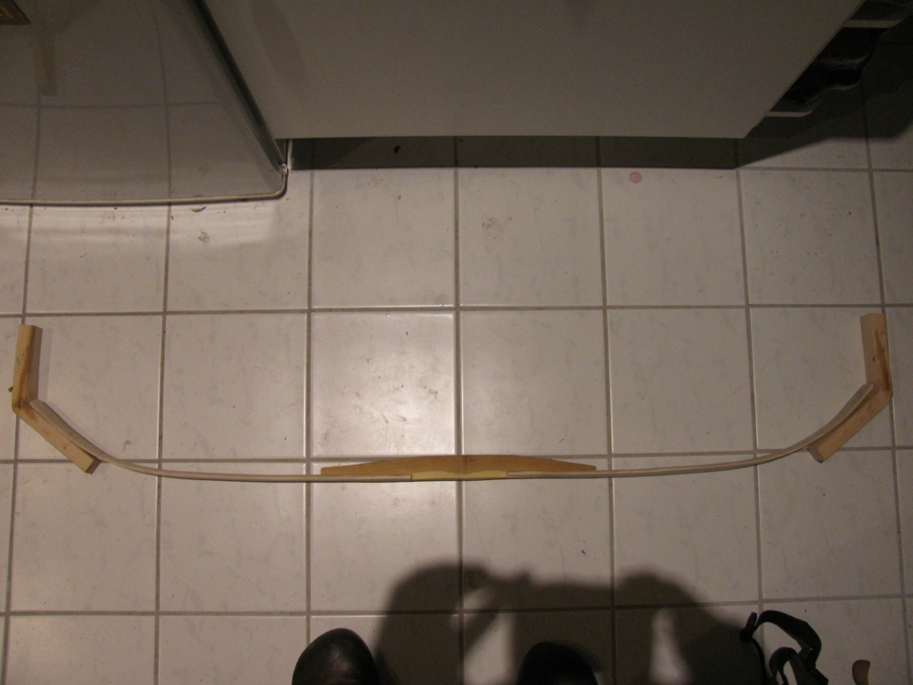 sieht schonmal mehr nach Bogen aus. Allerdings sind die Wurfarme im Kasan-bereich noch leicht verdreht, was ich vor dem Verleimen noch mit der HLP zu korrigieren gedenke. Aber es fluchtete schon mal recht zufriedenstellend.